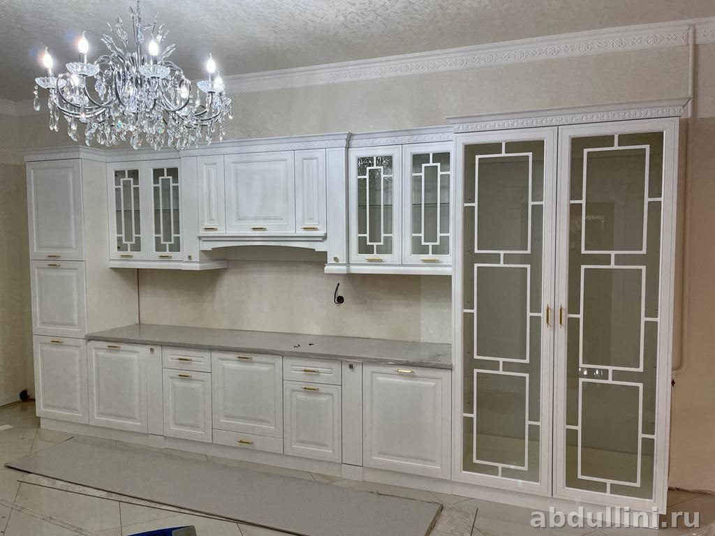 - Особенности: Фрезеровка на фасадах, декоративные карнизы, стеклянные дверцы с геометрическим узором.