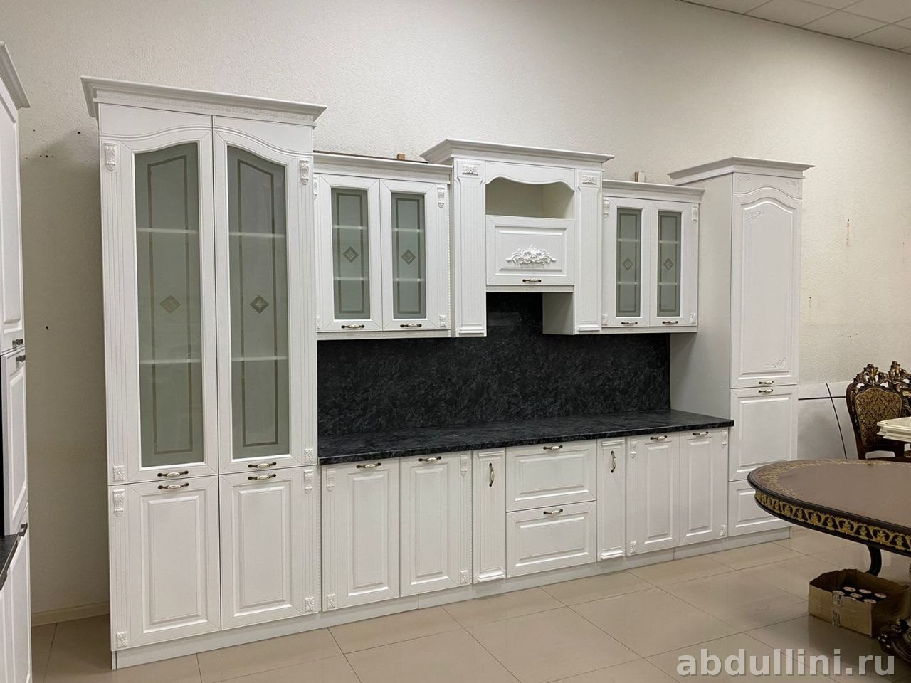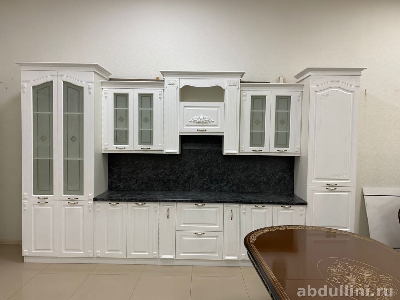 - Комплектация: шкаф-витрина с двумя стеклянными дверцами, навесные шкафы с глухими и стеклянными дверцами, напольные шкафы с выдвижными ящиками, высокий шкаф-пенал.