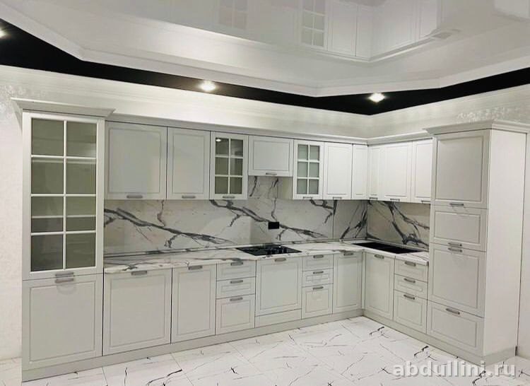 Цвет гарнитура — белый, фасады выполнены из крашеного МДФ с матовой или слегка шелковистой отделкой. Корпус шкафов изготовлен из ЛДСП. Столешница и фартук имитируют мрамор с серыми прожилками.