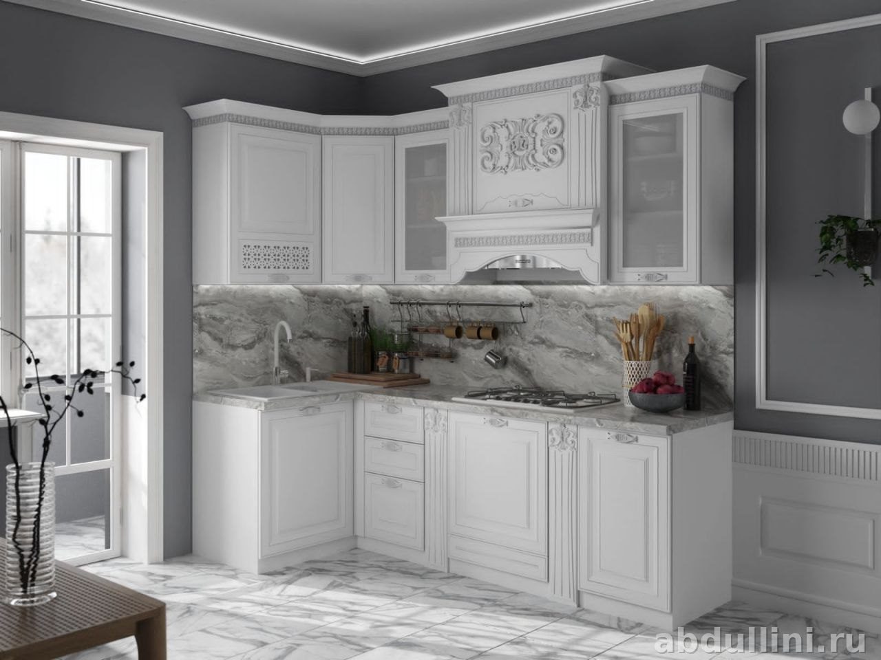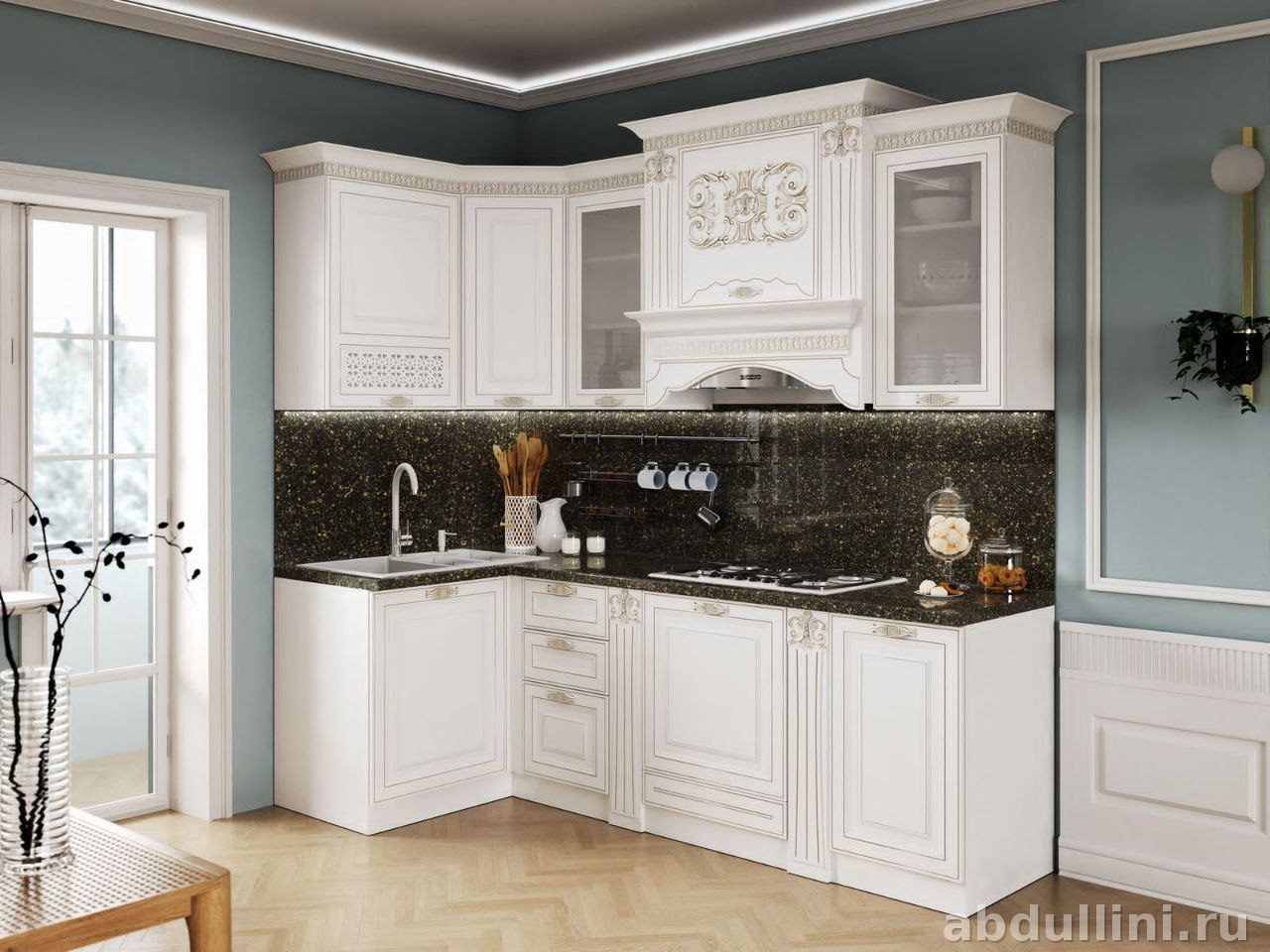 Кухня Марина — классический гарнитур с филенчатыми фасадами и декоративными элементами. В комплект входят верхние и нижние шкафы, вытяжка и столешница с имитацией мрамора или гранита. Угловой шкаф с мойкой, выдвижные ящики и стеклянная дверца на верхнем шкафу делают кухню функциональной.