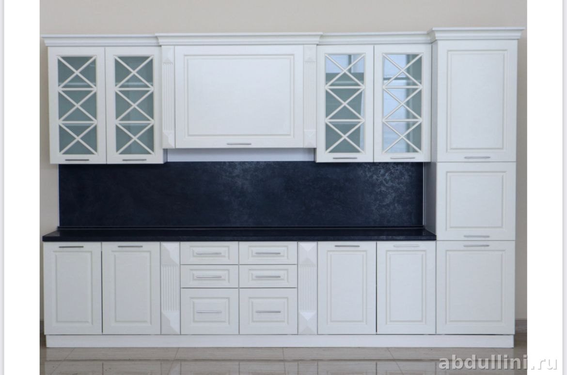 Гарнитур собран крепко, без люфтов. Подойдет для просторной кухни — места хватит для всей посуды и утвари. Доставка по России, сборка под ключ.