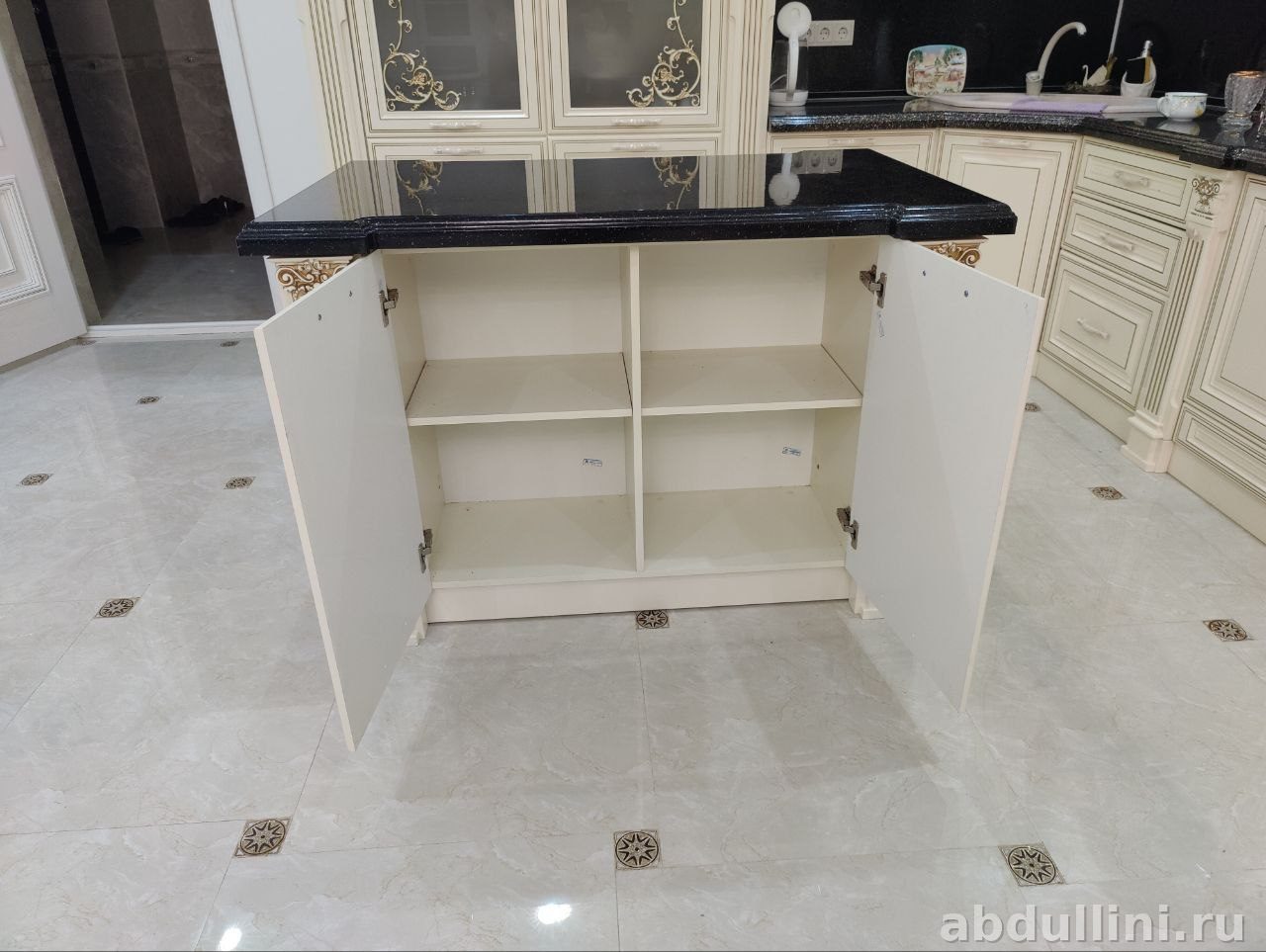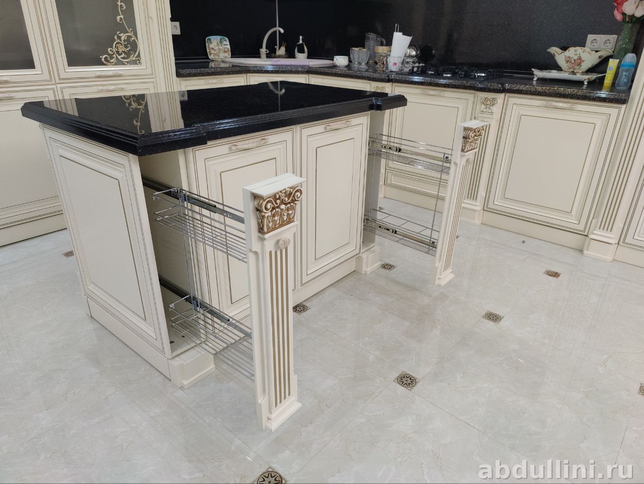 - Цвет и отделка: Кремовые фасады с золотистой патиной, матовая поверхность с эффектом состаренности. Столешница острова — черный глянцевый камень.