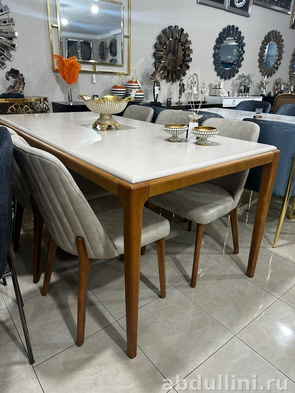 Комплект выполнен в современном стиле с элементами минимализма. Белая столешница и деревянная рама создают красивый контраст. Стулья дополняют общий вид, добавляя уюта и комфорта.