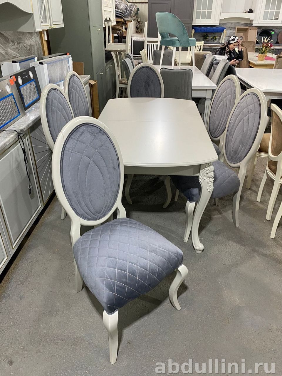 Комплект для обеденной зоны, состоящий из раскладного стола и шести стульев. Стиль – неоклассика: элегантные формы, светлые тона, минимализм в декоре. Подойдёт для тех, кто ценит функциональность и эстетику.