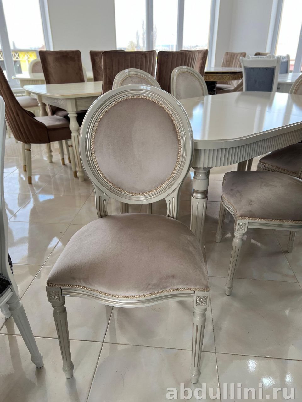 Комплект из стола и шести стульев в стиле неоклассика. Стол имеет раздвижную конструкцию, что делает его практичным для небольших помещений. Столешница выполнена из МДФ с глянцевым покрытием кремового или слоновой кости цвета, основание — из массива дерева или МДФ, окрашено в светло-серый с серебристым оттенком.