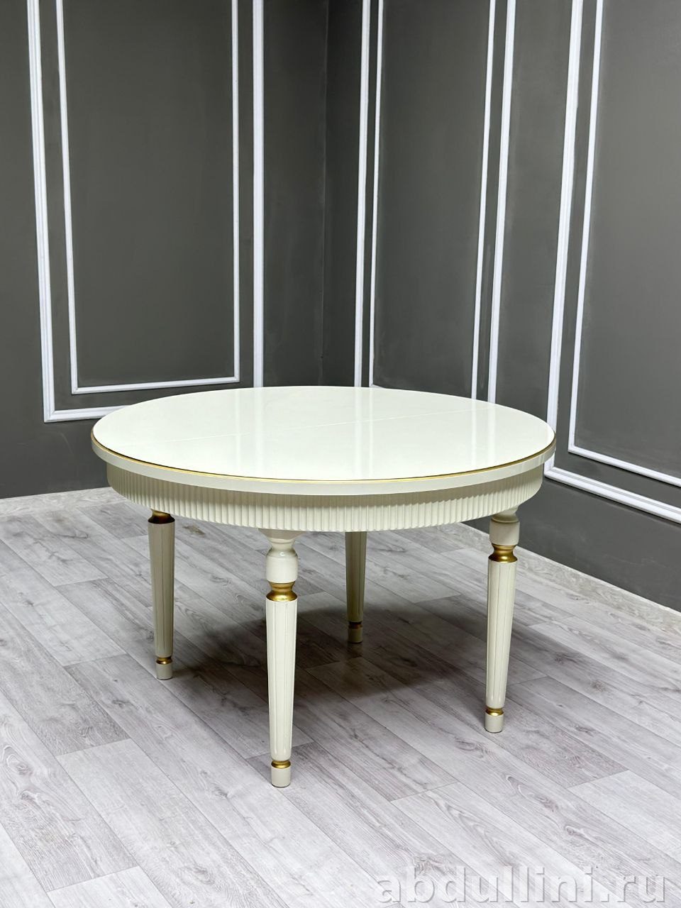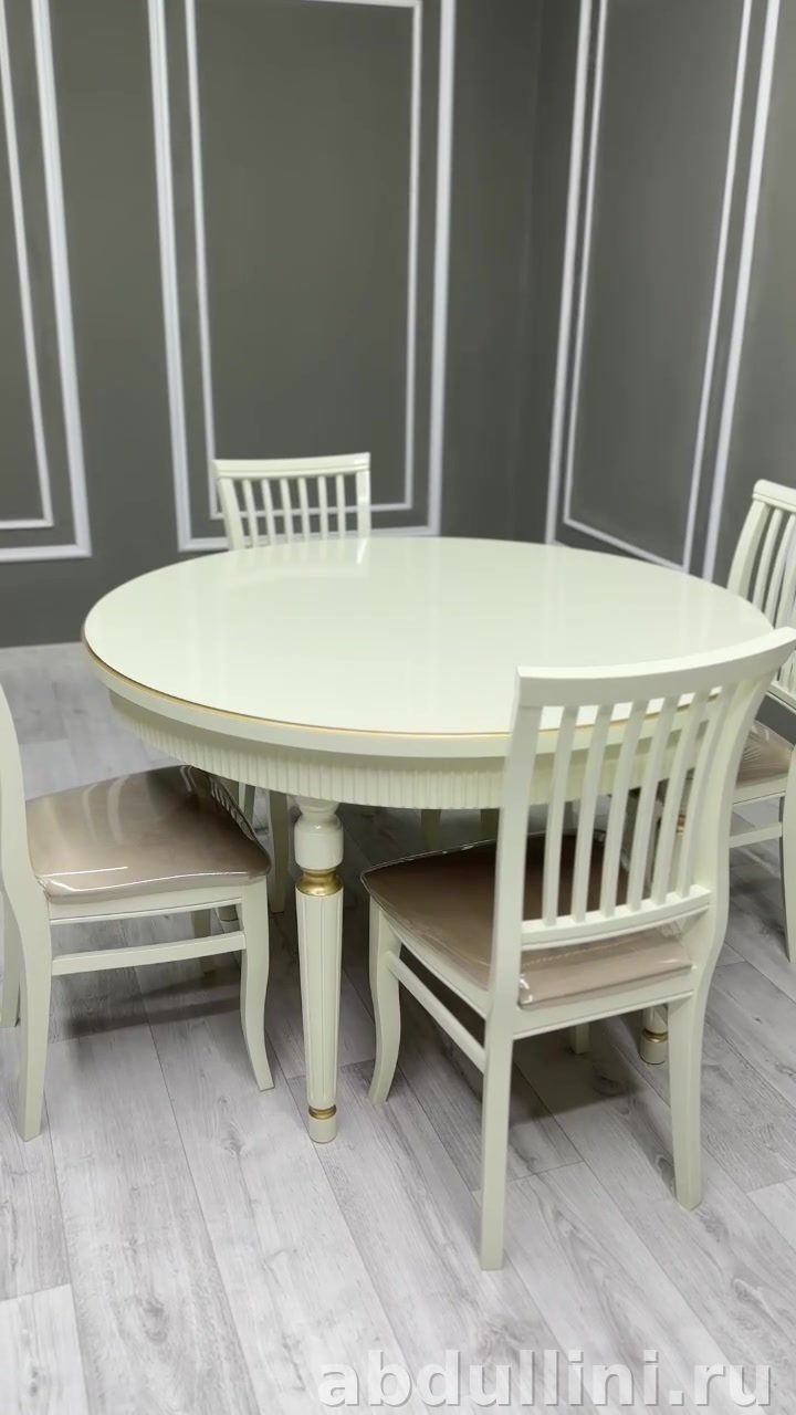 Комплект в неоклассическом стиле: круглый стол на четырех ножках и четыре стула с мягкими сиденьями. Основной цвет — кремово-белый (слоновая кость), декор — золотистые полосы по краю столешницы и на ножках.