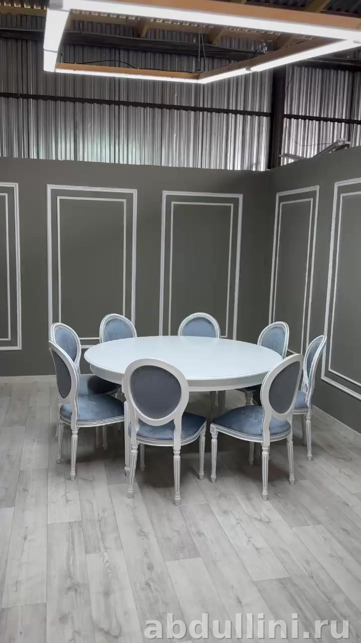 Комплект из круглого обеденного стола и восьми стульев в стиле неоклассика. Идеально подходит для просторных помещений или больших семейных обедов. Цветовая гамма — белый матовый стол и стулья с серебристой патиной, обивка сине-серого оттенка. Мебель изготовлена из качественных материалов: МДФ или массива дерева (стол), массива дерева с мягкой обивкой (стулья).