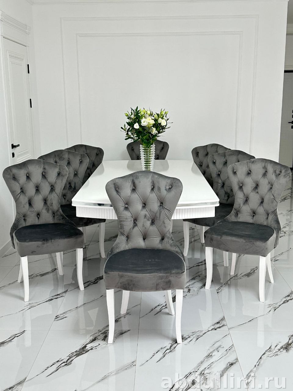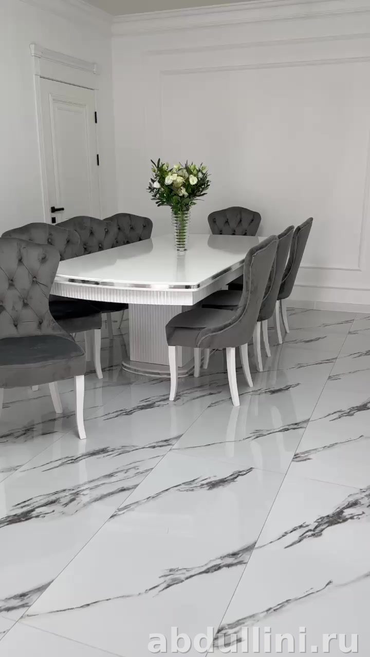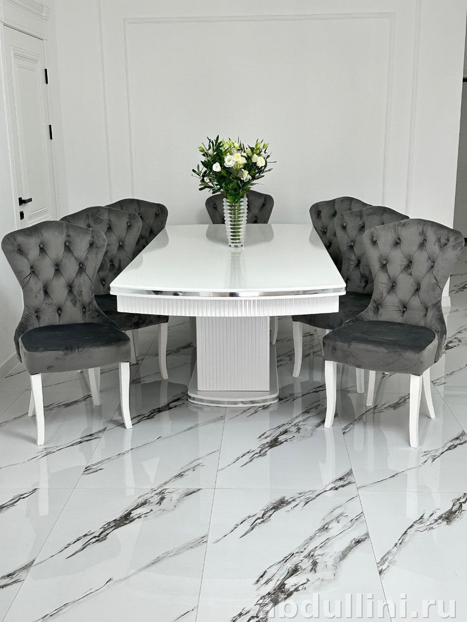 Стол Грация выполнен из МДФ с глянцевым покрытием белого цвета. Основание стола украшено вертикальными полосами и дополнено хромированными элементами. Стулья Сурен обтянуты бархатной тканью серого цвета, каркас из дерева с глянцевыми ножками. Спинка стульев оформлена в технике капитоне (ромбовидная стяжка), что добавляет изделиям изысканности.