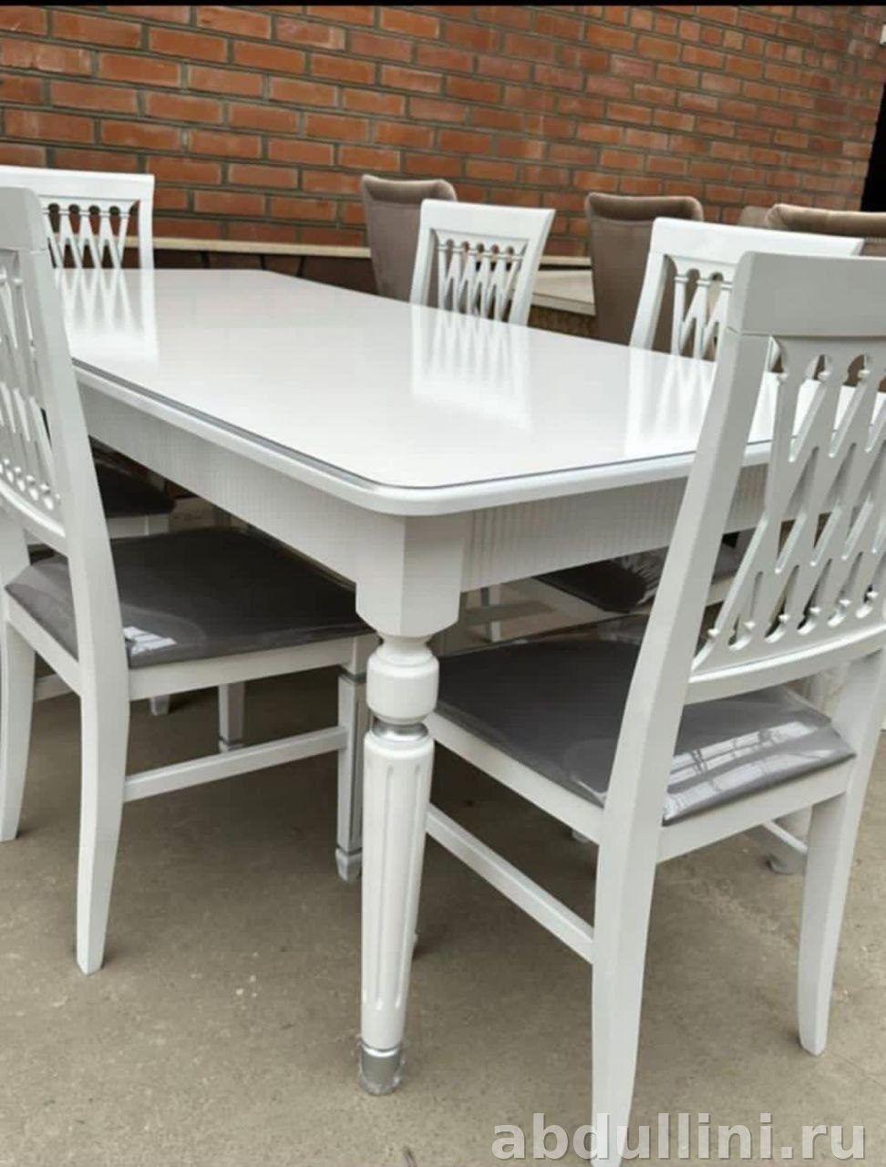 Основной цвет комплекта — белый. Столешница имеет глянцевое покрытие, которое добавляет модный акцент. Ножки стола и каркасы стульев выполнены в матовом белом цвете, а сиденья стульев — в сером оттенке. Декоративные серебристые вставки на ножках стола и резной узор в виде ромбов на спинках стульев придают комплекту изысканность.