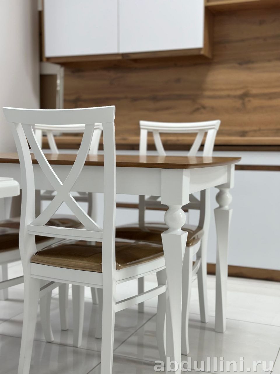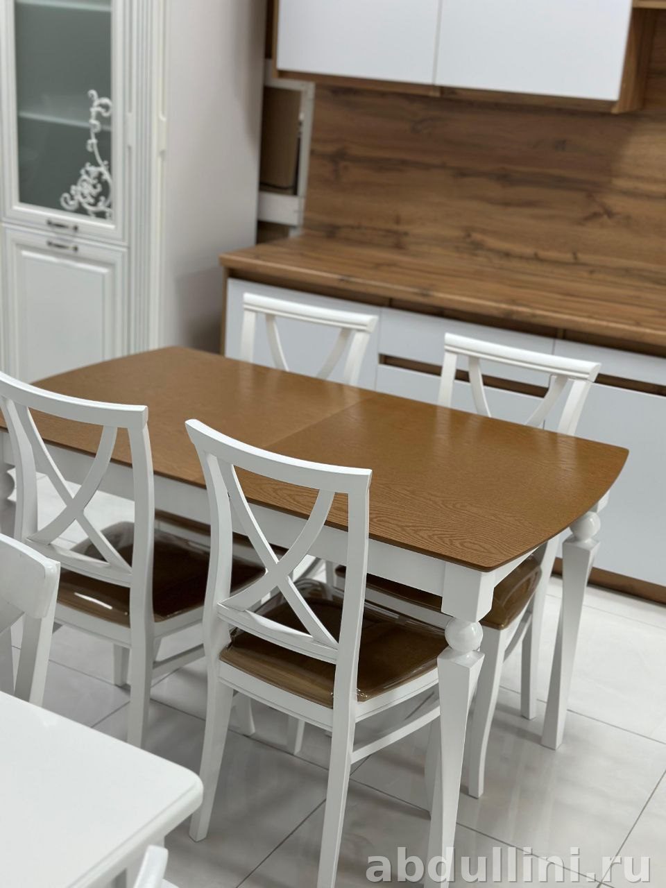 Стиль: Классика с элементами неоклассики. Белый цвет и декоративные элементы (шары на ножках стола, планки на спинках стульев) придают комплекту сдержанную элегантность.