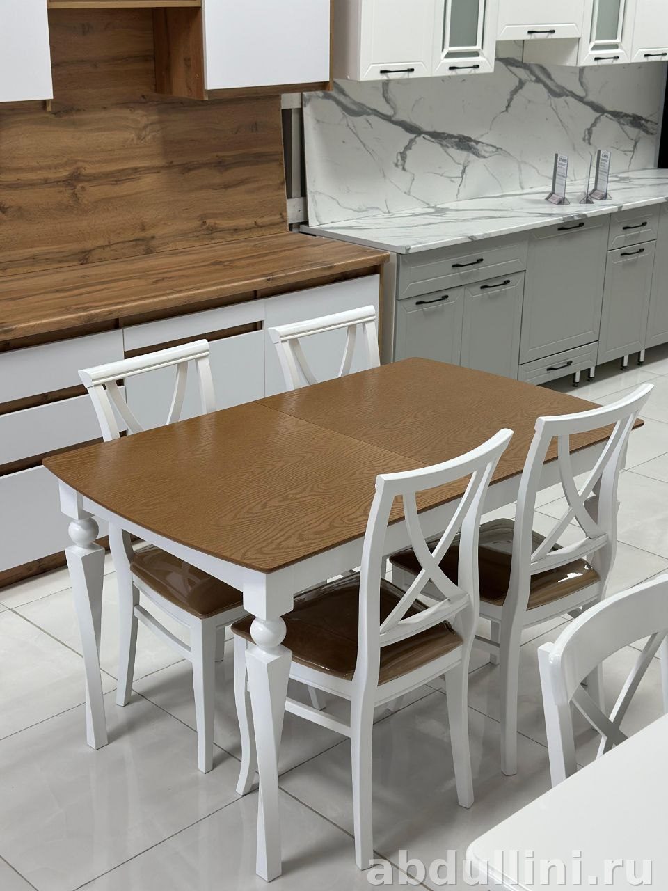 Комплект мебели для обеденной зоны, который включает раздвижной стол и четыре стула. Идеально подходит для кухни или столовой. Стол и стулья выполнены в белом цвете с элементами классического дизайна.