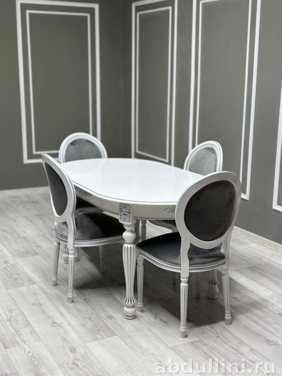 Стиль неоклассика подчеркивается сдержанным декором, светлыми тонами и изящными формами. Комплект подойдет для просторной столовой или гостиной.
