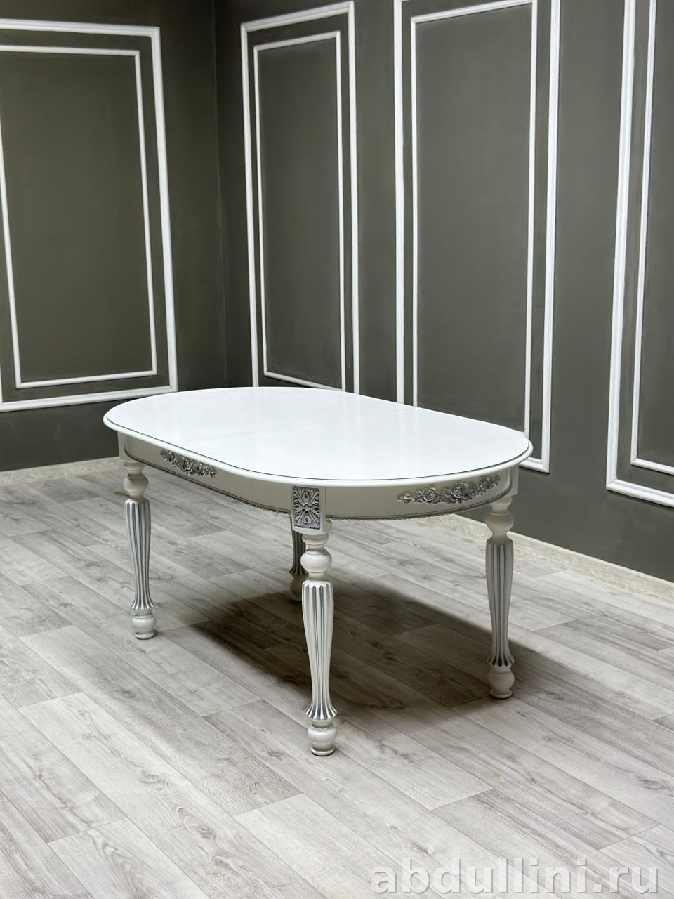 - Цвет: белая столешница с глянцевым покрытием, ножки и декор — белые с серебристой патиной.