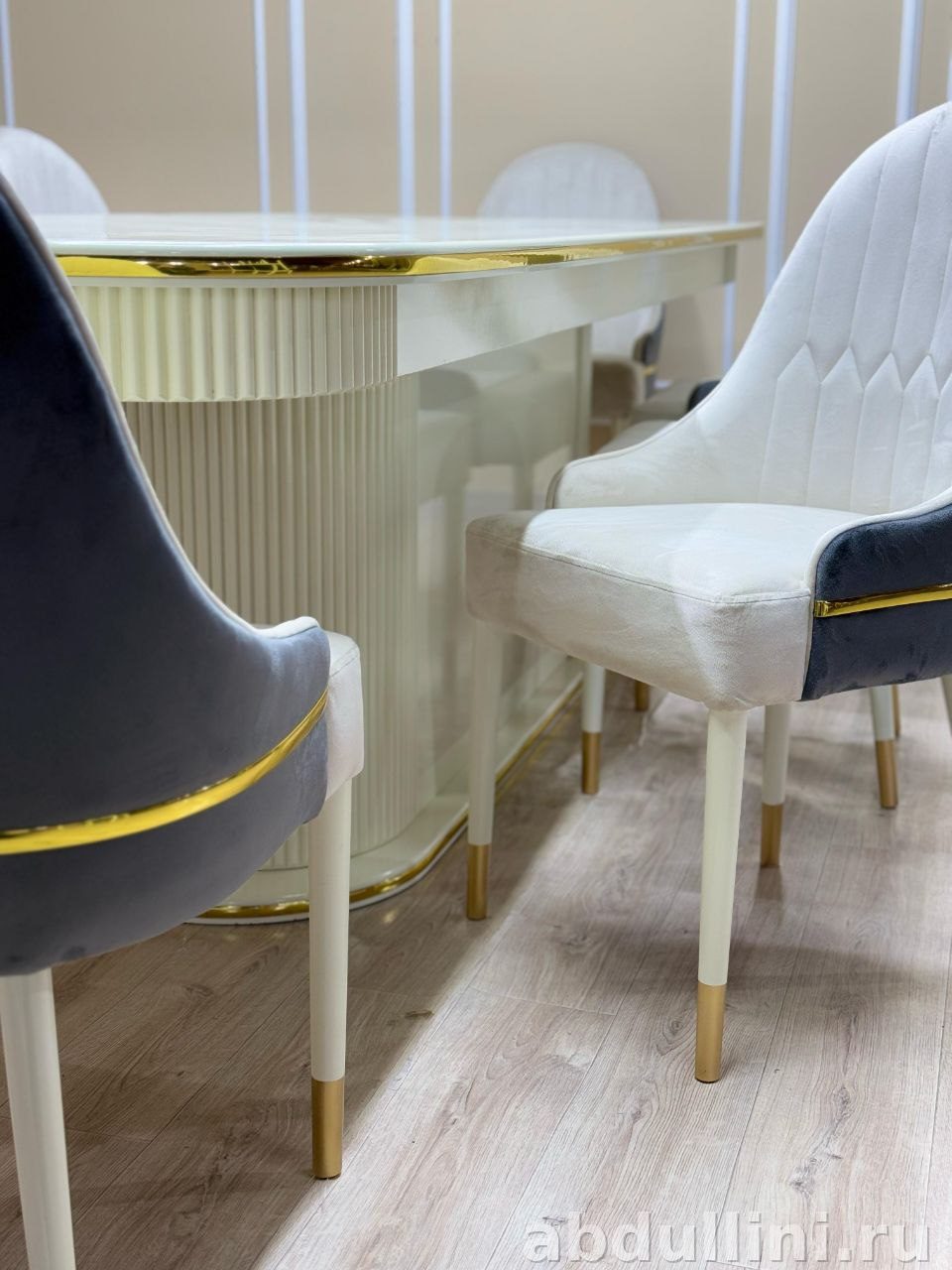 Комплект мебели для столовой или гостиной включает обеденный стол и стулья. Стол Изабель выполнен в бежевом цвете с золотистыми акцентами, имеет прямоугольную столешницу и массивное основание. Стулья Ханиф сочетают светлый кремовый и темно-серый цвета, их спинки украшены декоративной прострочкой в виде ромбов.