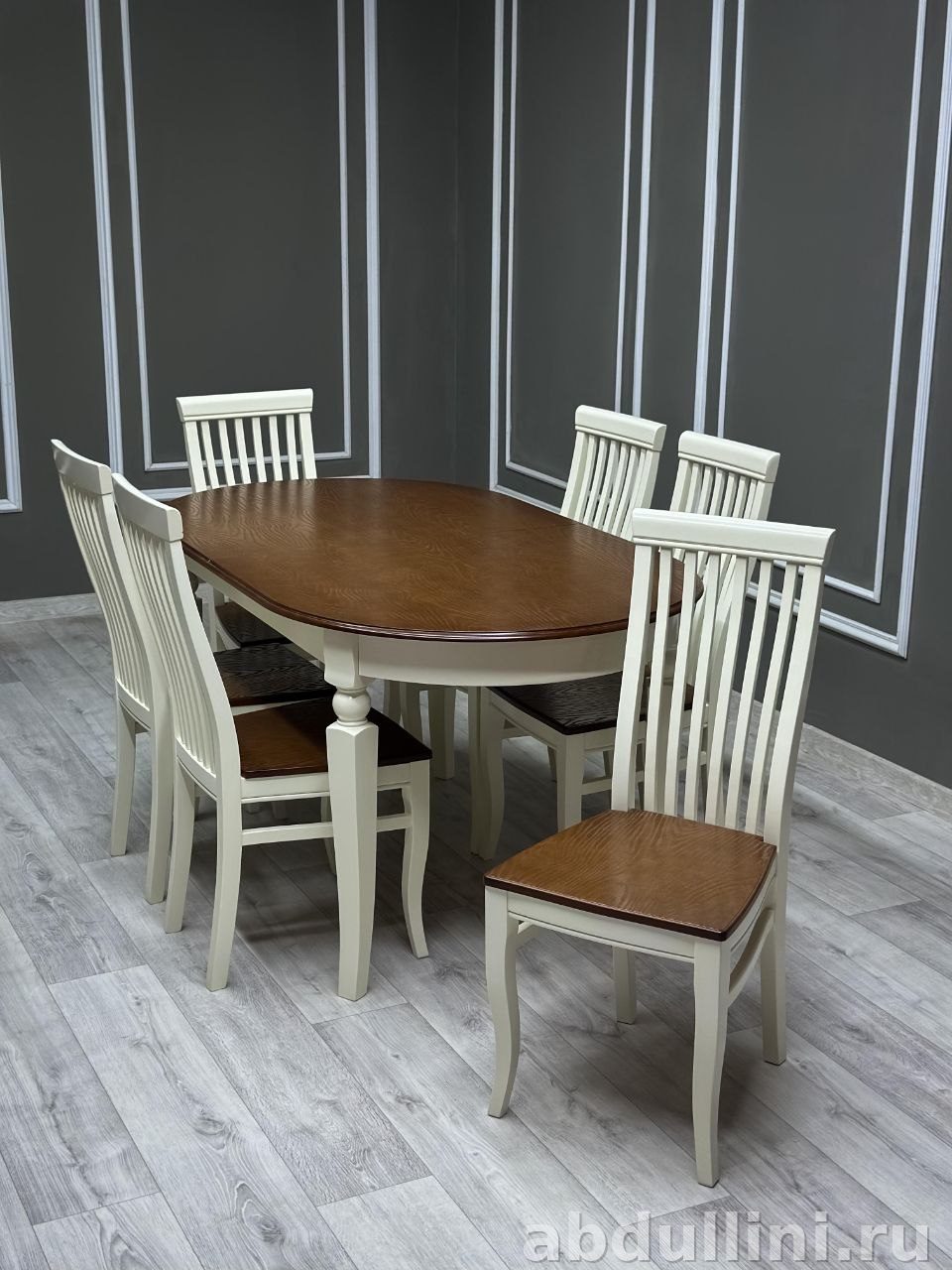 Комплект включает овальный раздвижной стол «Кадис» и шесть стульев. Стол выполнен в древесном оттенке, напоминающем орех или вишню, с белой окантовкой по краям столешницы. Ножки и каркас стола — кремово-белого цвета. Стулья имеют каркас в тон столу, сиденья обиты темно-коричневой экокожей, спинки украшены вертикальными планками.