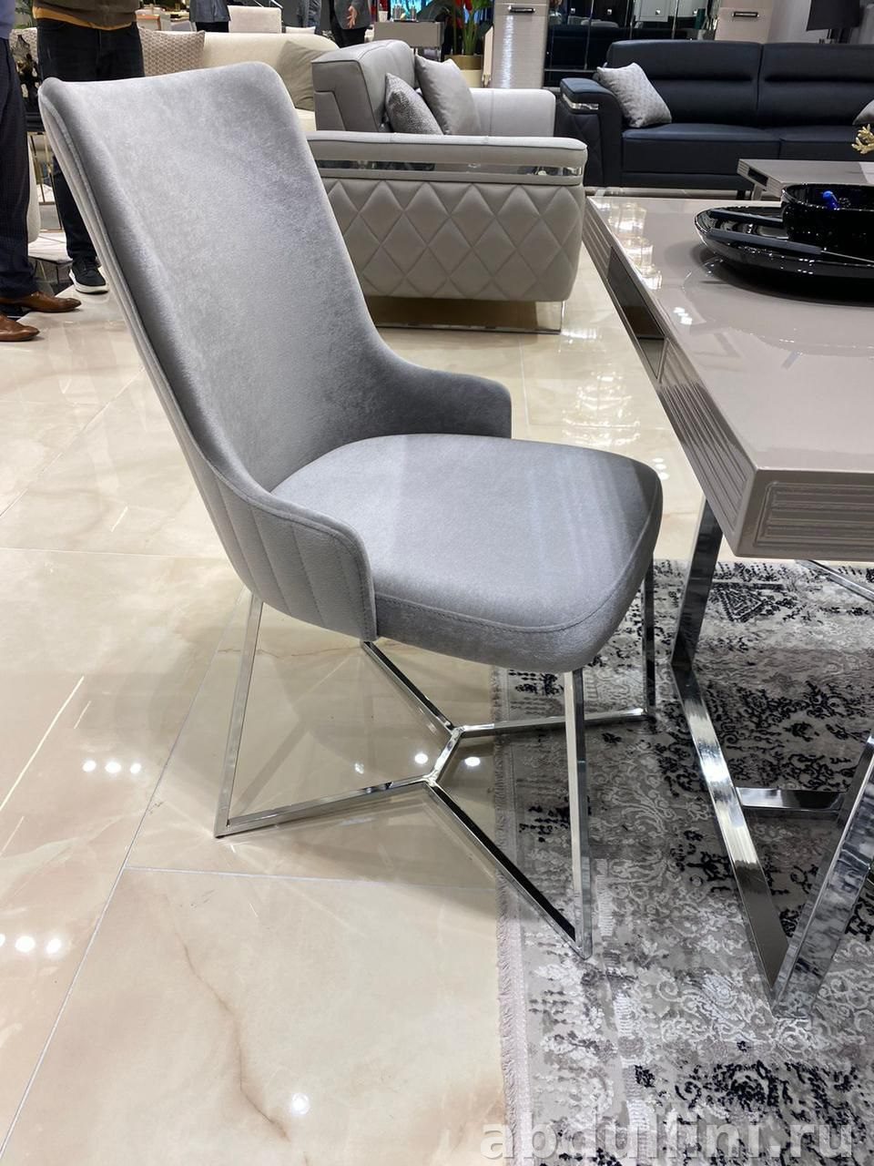 Стол имеет глянцевую столешницу из МДФ светло-бежевого цвета, которая легко впишется в любой интерьер. Основание стола выполнено из металла с хромированной отделкой, что добавляет ему устойчивости и современного вида. Стулья обтянуты мягкой тканью светло-серого цвета, а их металлические ножки также имеют хромированное покрытие. Декоративная прострочка на спинках стульев придает комплекту изысканности.