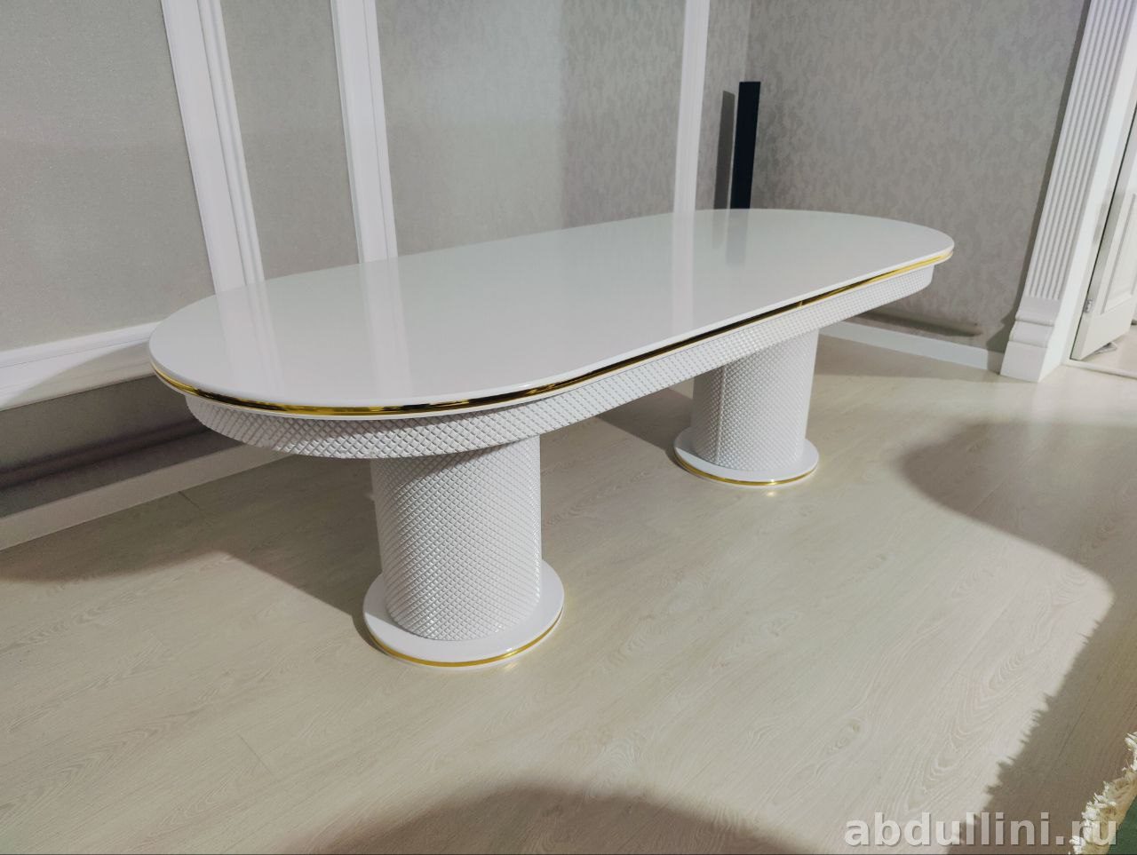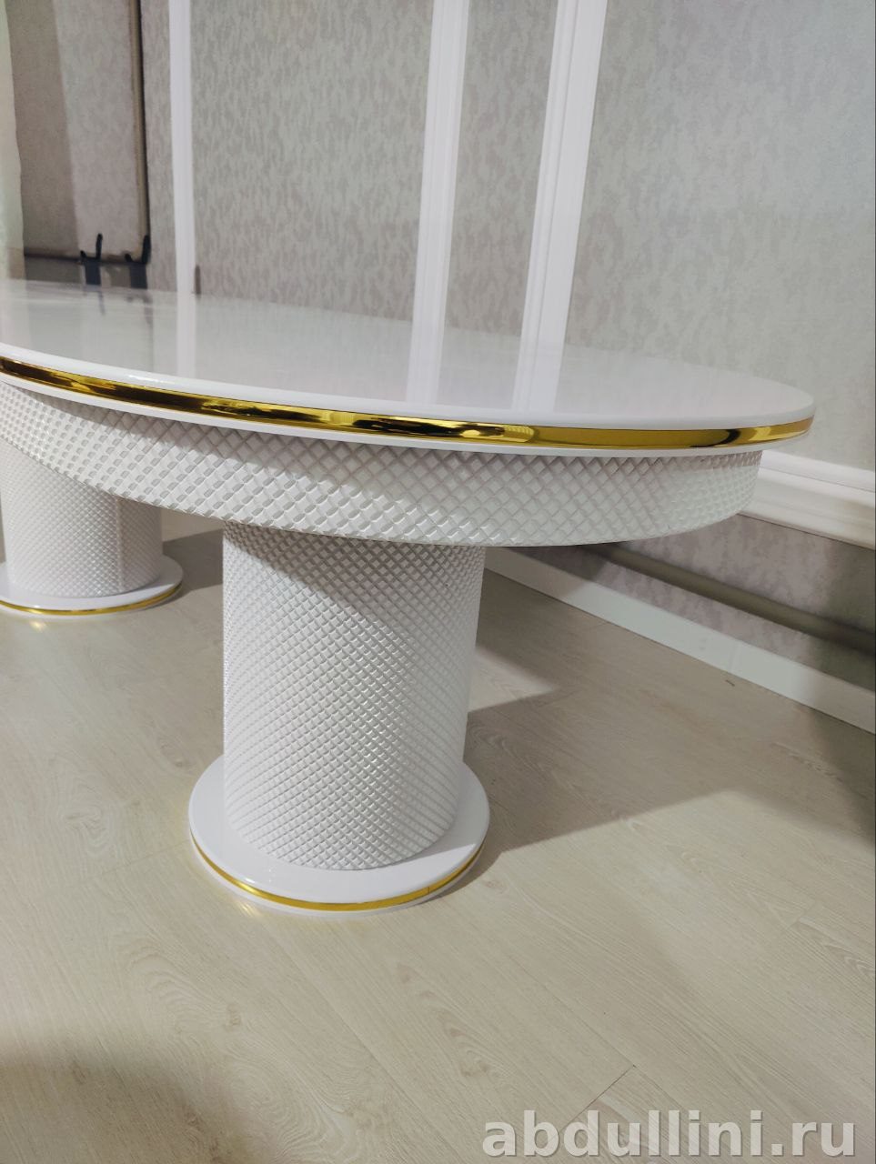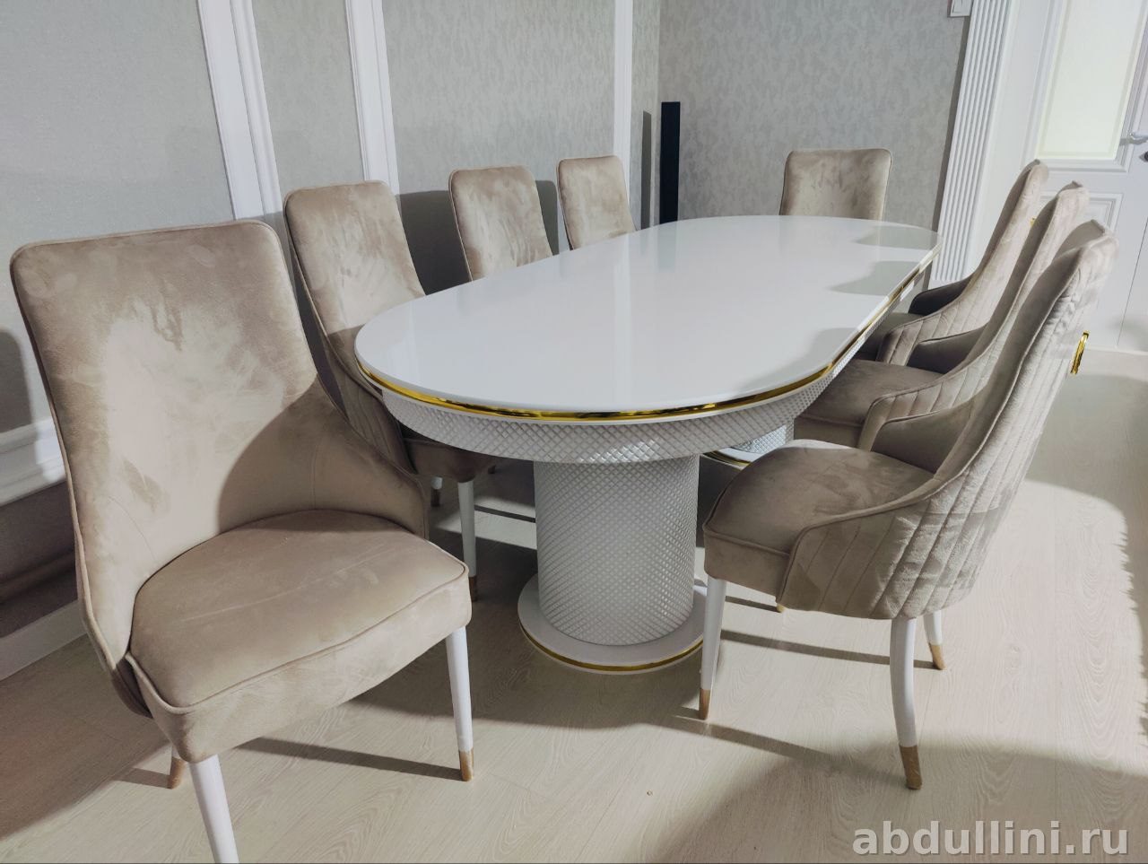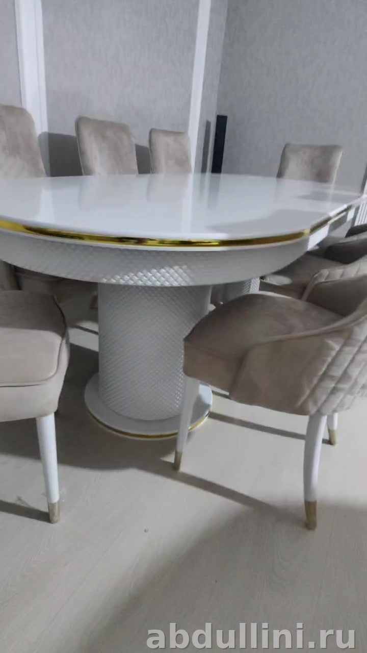 Комплект обеденной мебели 3642 Шанель — это стильное решение для вашей столовой. В комплект входят стол и 8 стульев, выполненных в едином дизайне. Стол имеет овальную глянцевую столешницу белого цвета с золотистой окантовкой и текстурированное основание, имитирующее плетёный узор. Стулья обтянуты светло-бежевой тканью с вертикальной стёжкой, ножки белые с золотистыми наконечниками.