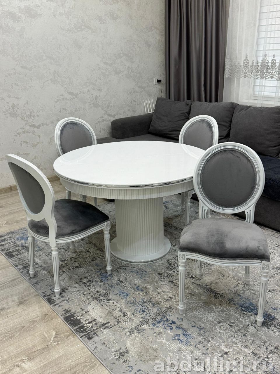- Стулья: каркас из массива дерева (белый), обивка — серый велюр.