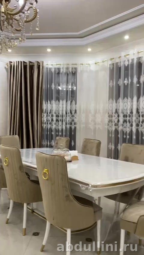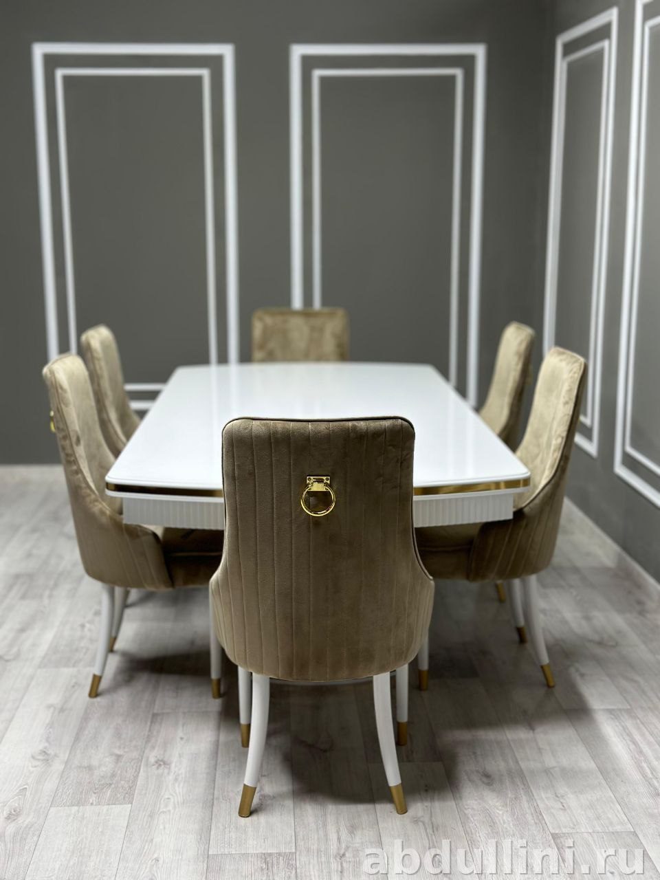 - Стулья: велюровая обивка в золотисто-бежевом оттенке, ножки белые с золотистыми наконечниками. Спинки украшены декоративными золотистыми кольцами.