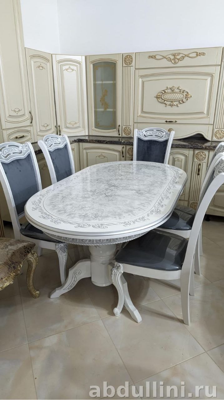 Комплект из овального стола и шести стульев в неоклассическом стиле. Идеально подходит для обеденной зоны в доме или квартире.