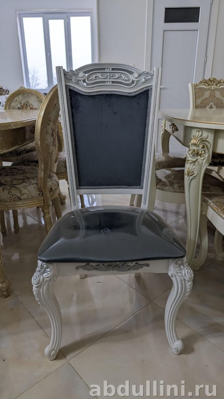 - Стулья: каркас белый с кремовым оттенком, обивка темно-серого цвета. Матовая отделка, рельефный узор на спинке, повторяющий мотивы стола.
