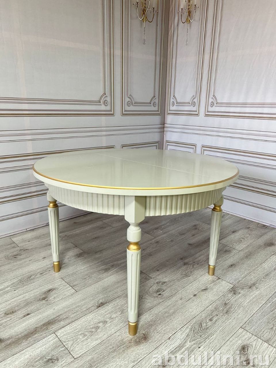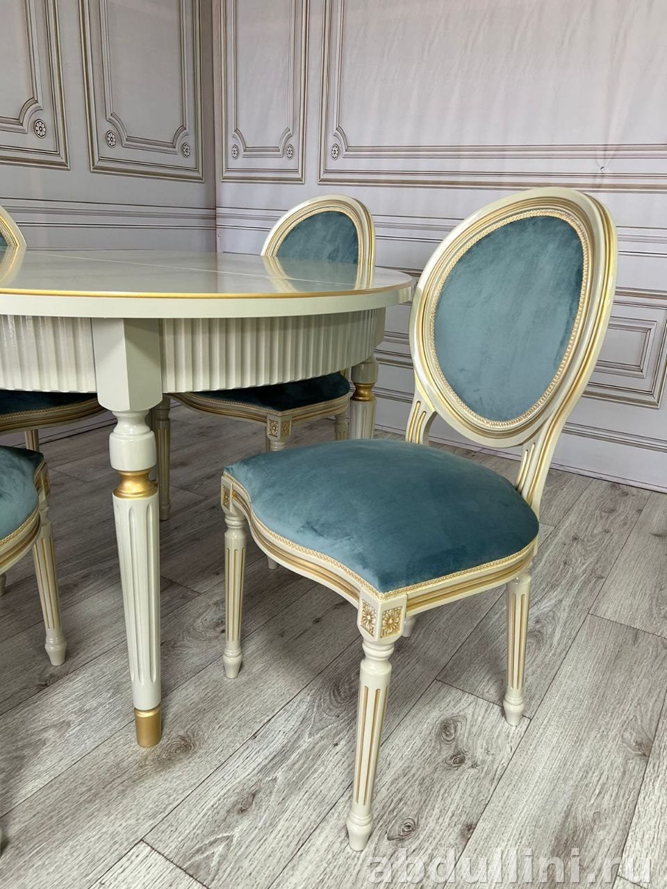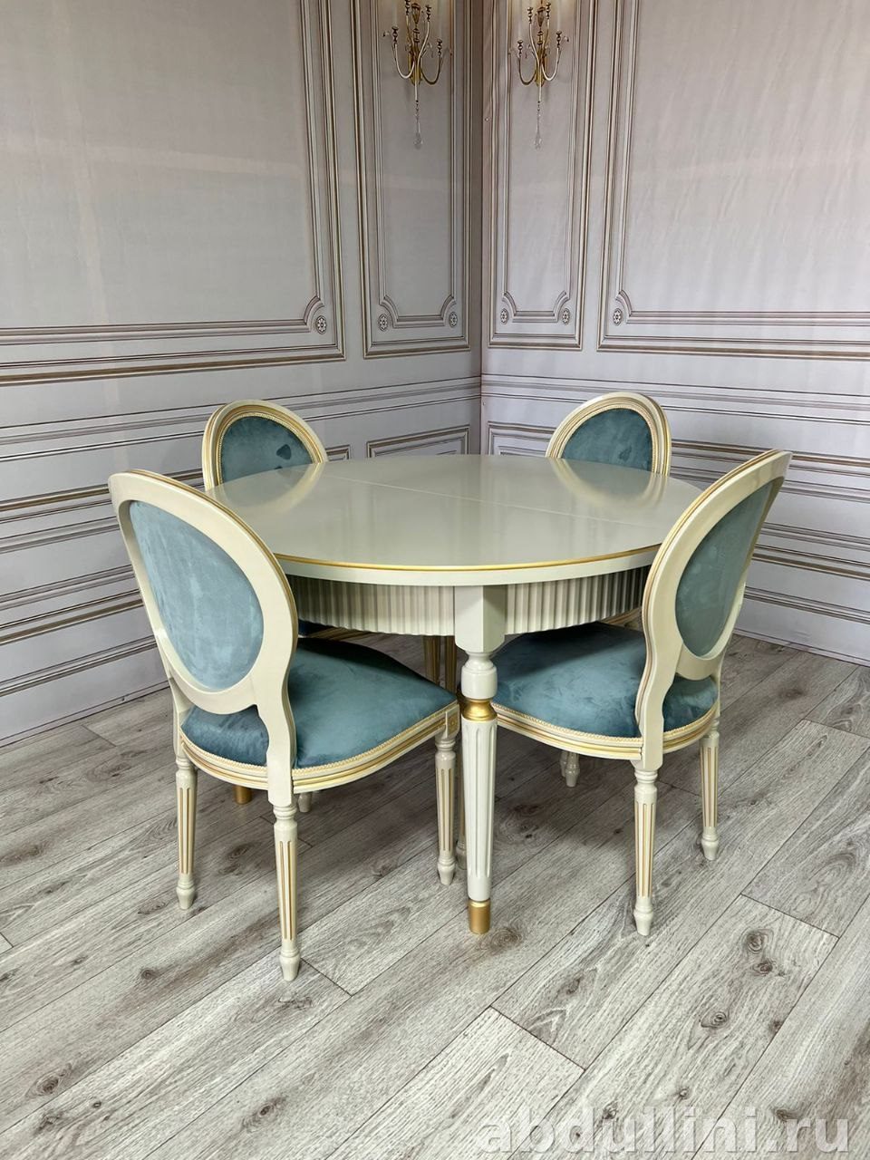 Комплект из стола и стульев в неоклассическом стиле. Подходит для кухни или столовой. В комплект входит круглый стол и четыре стула. Стол раздвижной, размеры: 120/160 см. Также доступна версия без раздвижного механизма — размер 120 см.