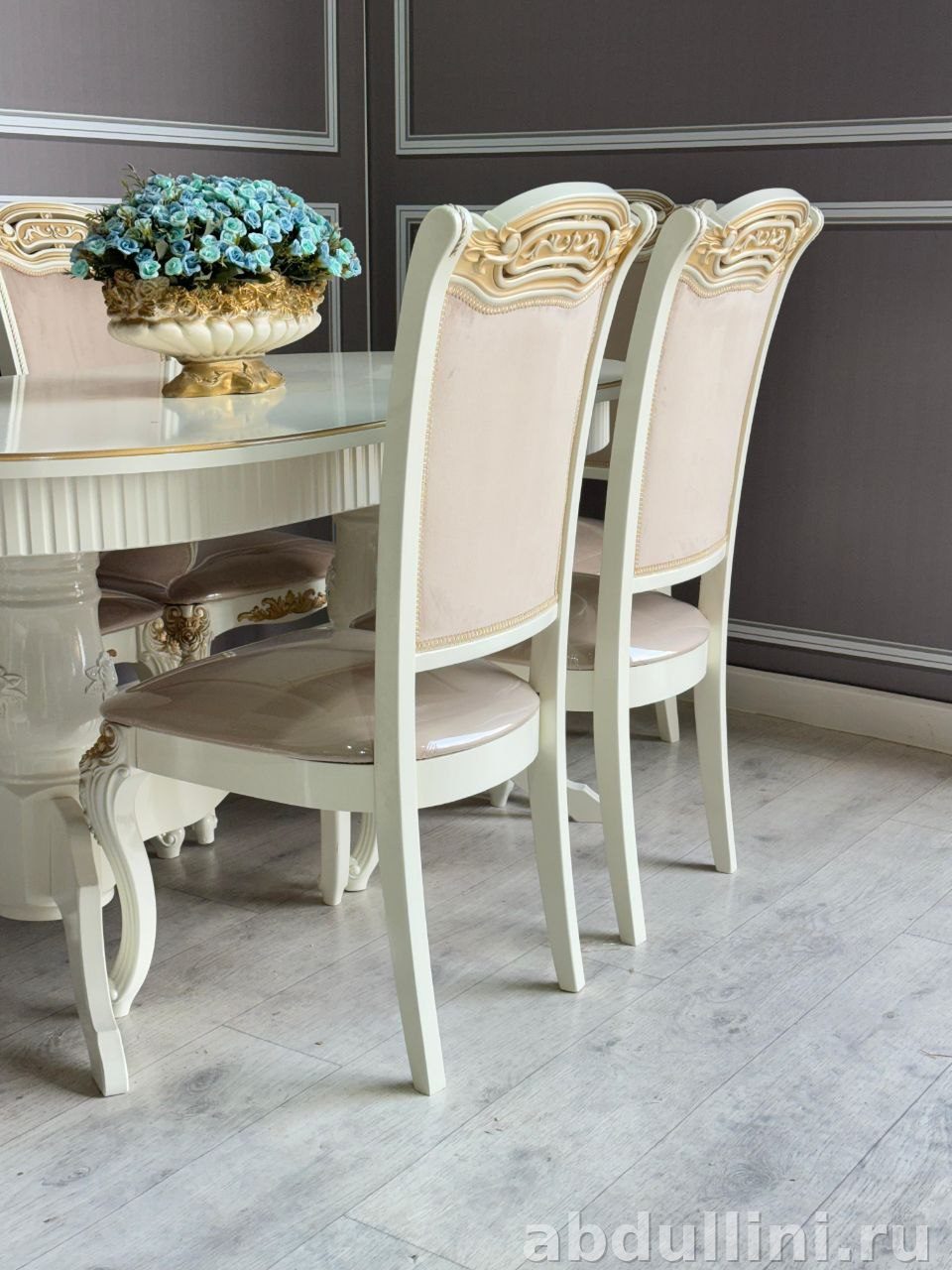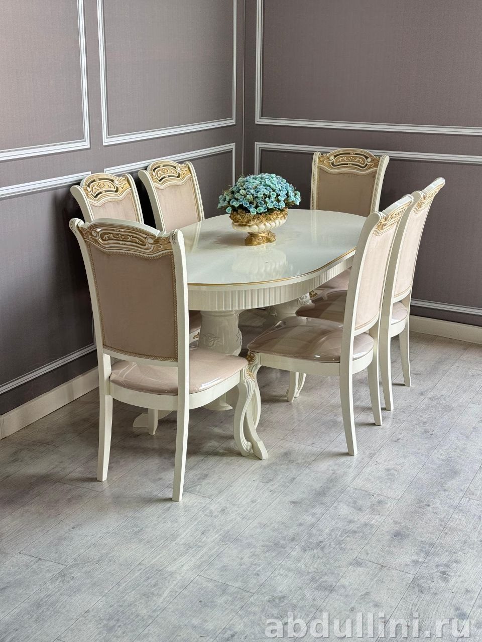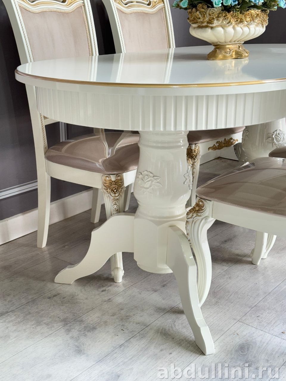 - Стол: Раздвижной, длина от 160 до 240 см, ширина 90-100 см, высота 80 см. Столешница из МДФ с глянцевым покрытием, ножки из массива дерева.