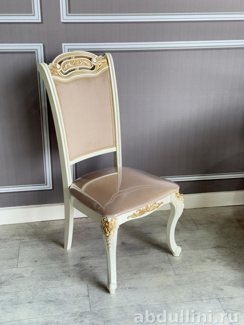 - Стулья: Высокая спинка с резными элементами, каркас из массива дерева, мягкая тканевая обивка.
