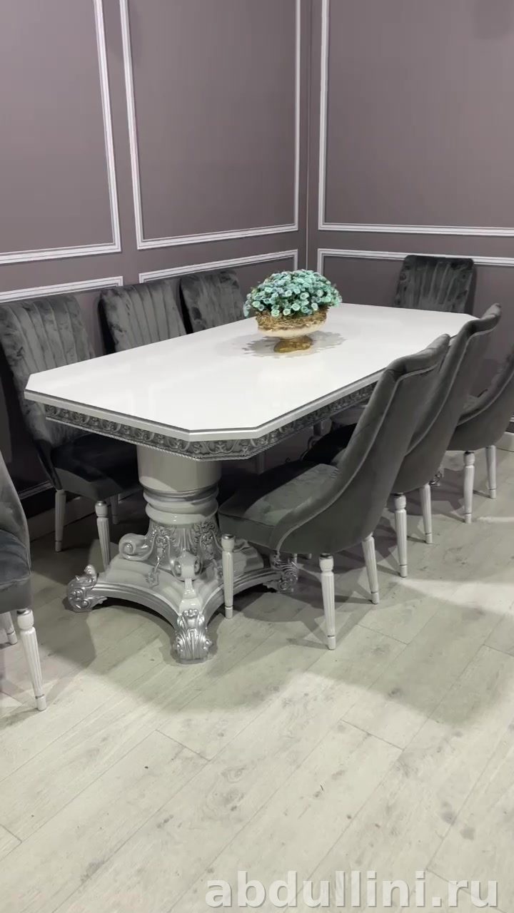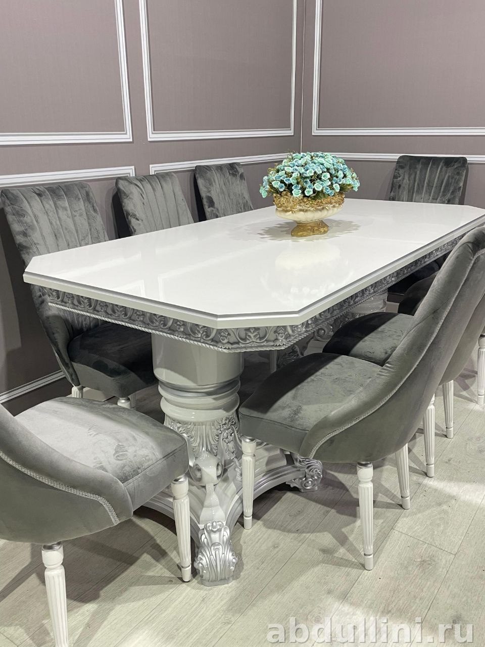 Комплект из стола и стульев в стиле неоклассика. Подходит для просторных столовых и кухонь. Стол раздвижной, что даёт увеличить длину столешницы в зависимости от ваших нужд. В комплект входит 6 стульев с удобной высокой спинкой.