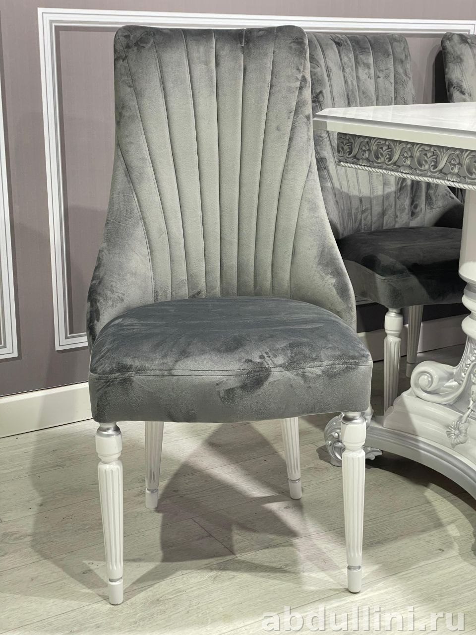 - Стулья: Обивка — серый матовый велюр с вертикальной прострочкой. Ножки — белые. Каркас — массив дерева.