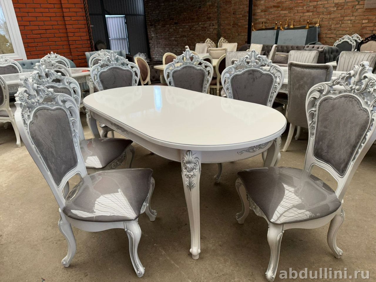 Комплект из стола и шести стульев в классическом стиле с элементами неоклассики. Стол с овальной глянцевой столешницей белого цвета и резными ножками. Стулья с высокими спинками, декоративной резьбой и мягкой обивкой серого цвета.