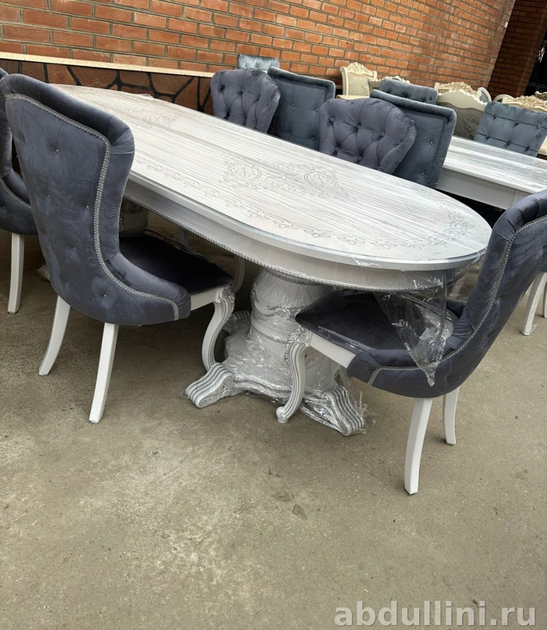 - Материалы: столешница — МДФ, основание — массив дерева, стулья — деревянный каркас с велюровой обивкой