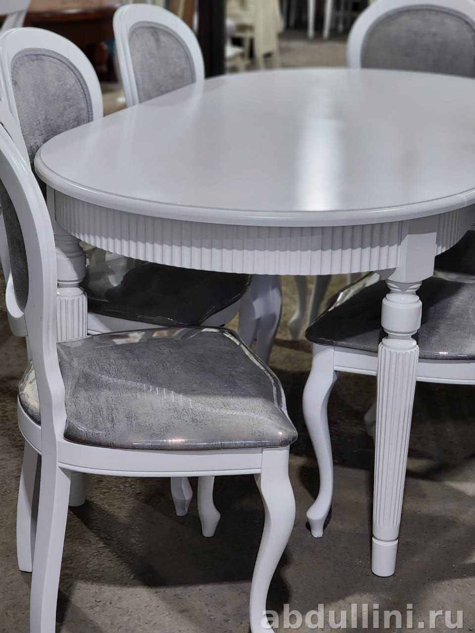 - Материалы: МДФ или массив дерева (белый матовый), обивка стульев — ткань с серебристым отливом