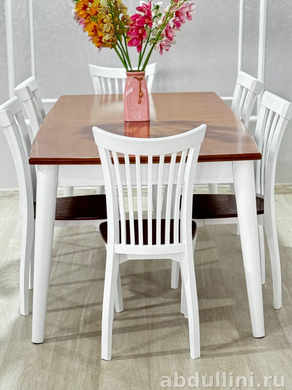 Комплект мебели для столовой включает обеденный стол Анкара и шесть стульев Виктория. Стол выполнен с деревянной столешницей насыщенного коричневого цвета и белыми матовыми ножками. Стулья полностью белые, с матовой отделкой и железными сиденьями, что делает их прочными и удобными.