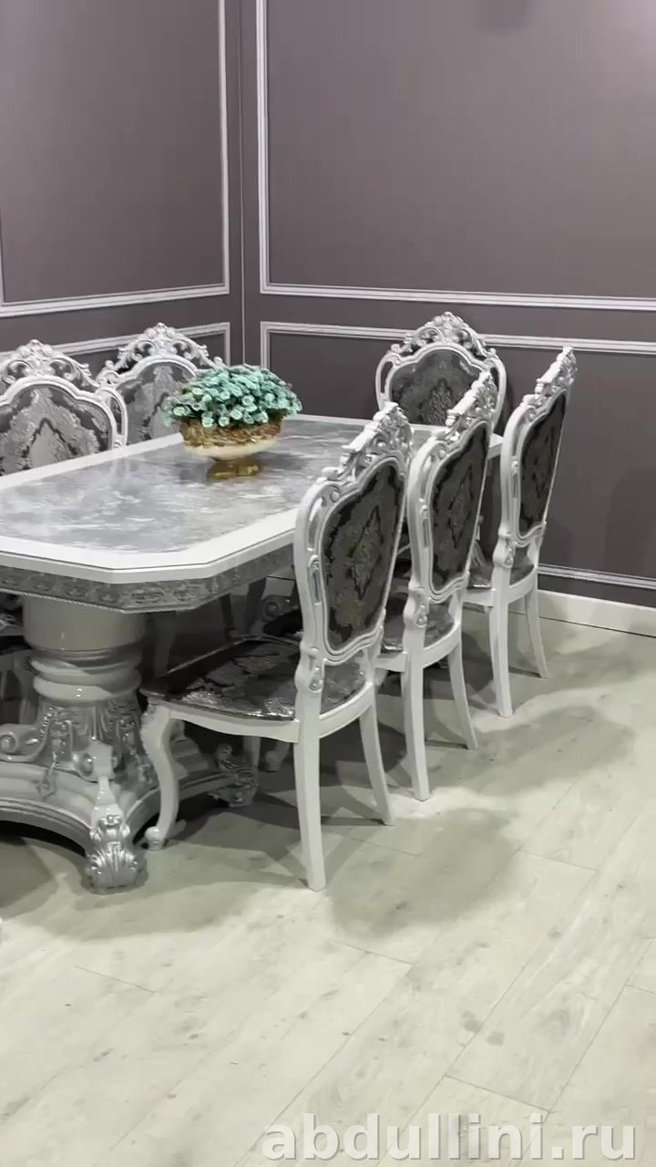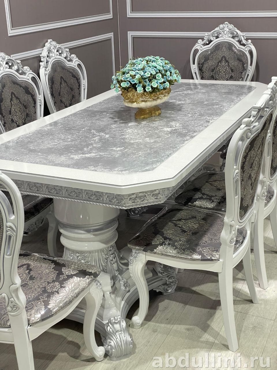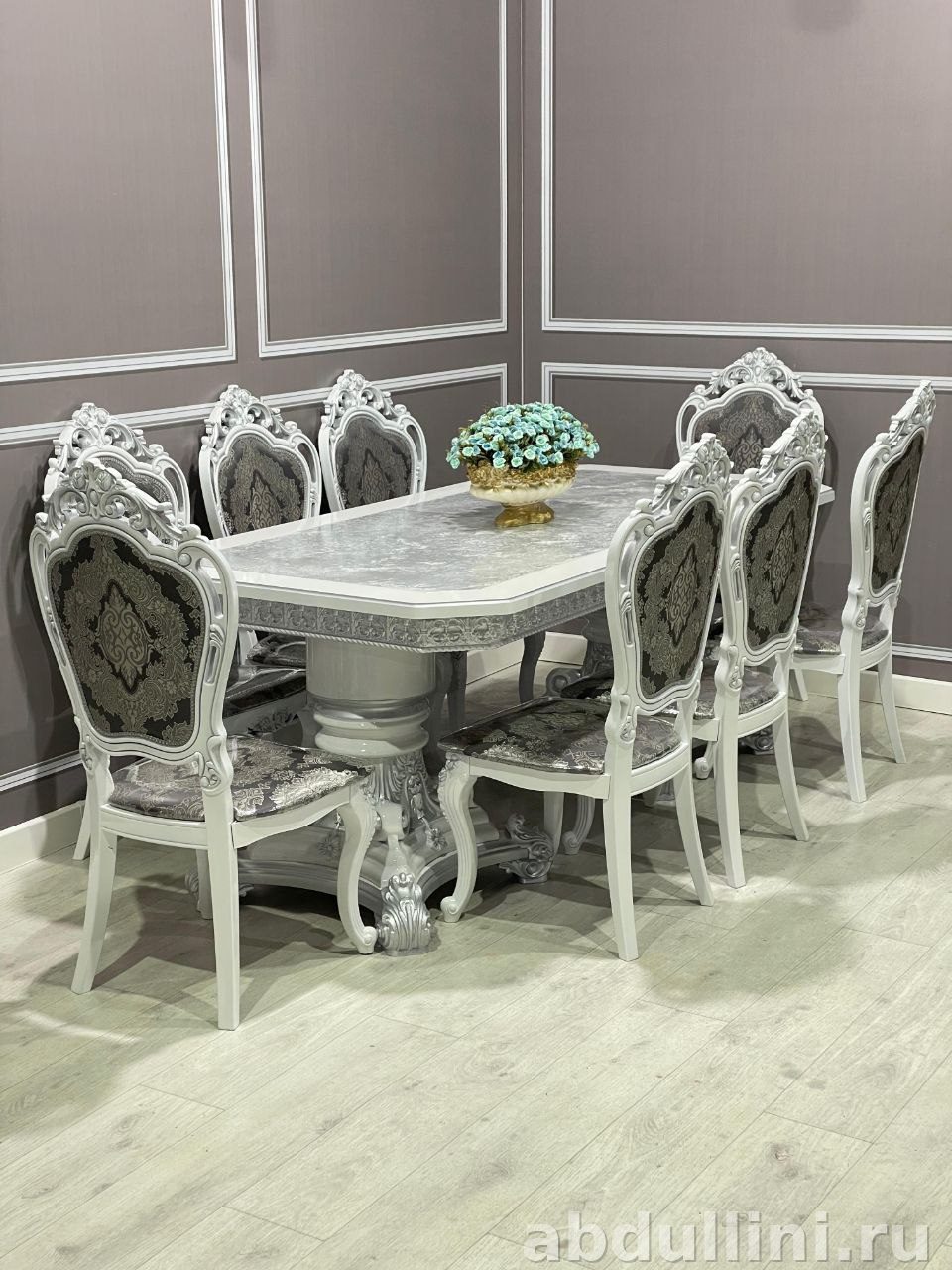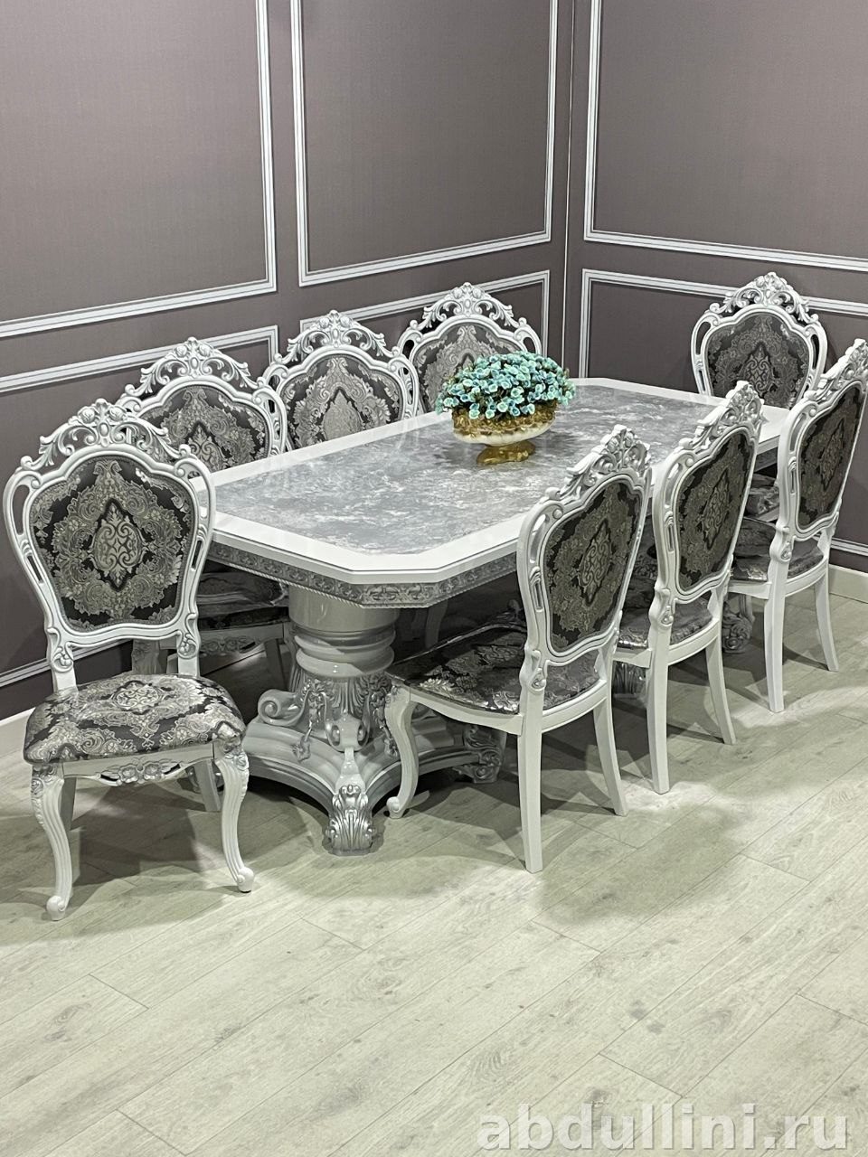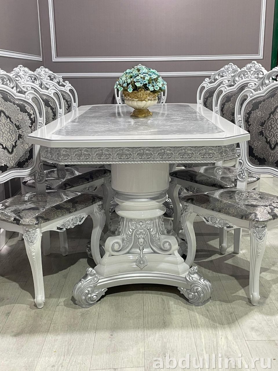 Прямоугольный раздвижной стол с резными ножками и стульями в стиле неоклассика. В комплекте стол и 8 стульев Мини-Шейх с высокими фигурными спинками.
