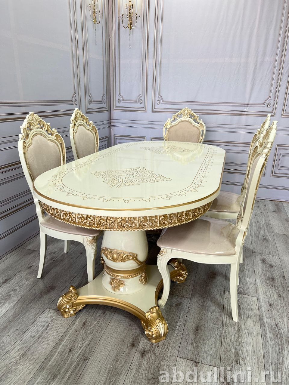 Цветовая гамма выполнена в оттенке слоновой кости (кремовый, ванильный). Столешница глянцевая, с золотой патиной на декоративных элементах. Стулья обтянуты светлым велюром с розоватым оттенком, каркас также украшен позолотой.