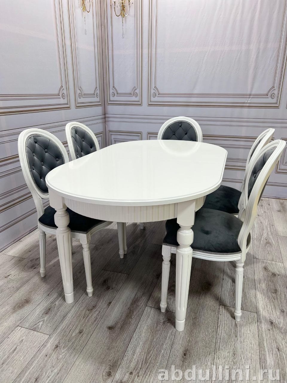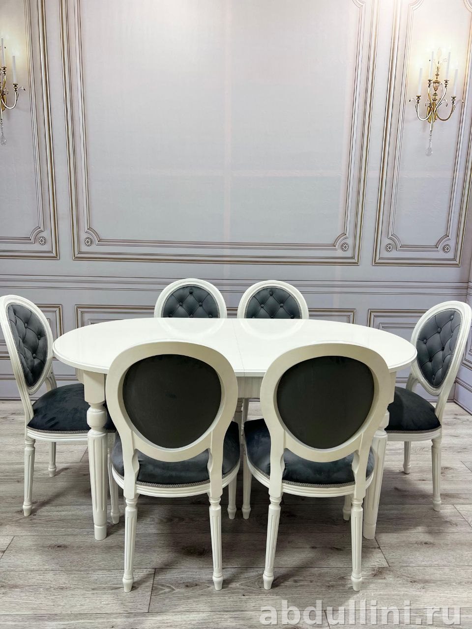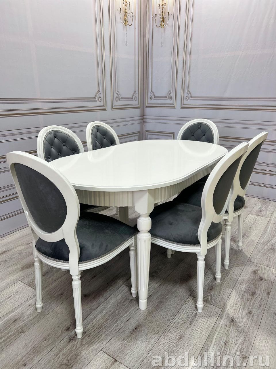 Комплект мебели 2246 — это практичное и стильное решение для обеденной зоны. В набор входит овальный стол и шесть стульев. Стол выполнен в белом глянцевом цвете, ножки массивные, точёные, с декоративными элементами. Столешница гладкая, с возможностью раздвижения, что делает стол универсальным для разных помещений.