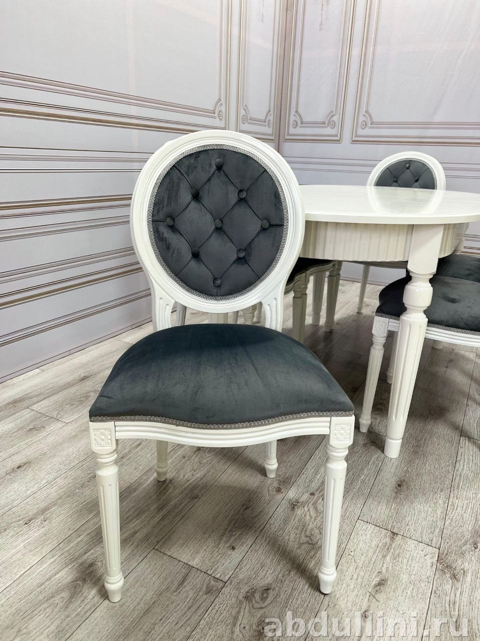 Стулья сочетают в себе комфорт и эстетику. Каркас белый, глянцевый, сиденья и спинки обтянуты тёмно-серой тканью, похожей на велюр или бархат. Спинка украшена декоративной стяжкой в виде ромбов (капитоне), а по периметру добавлена окантовка, возможно, с использованием гвоздиков или тесьмы.