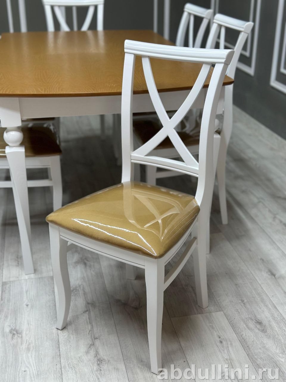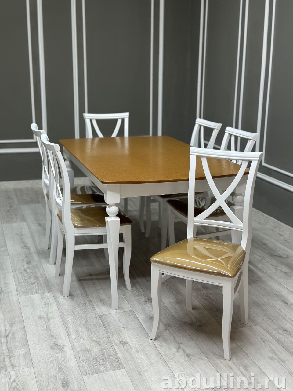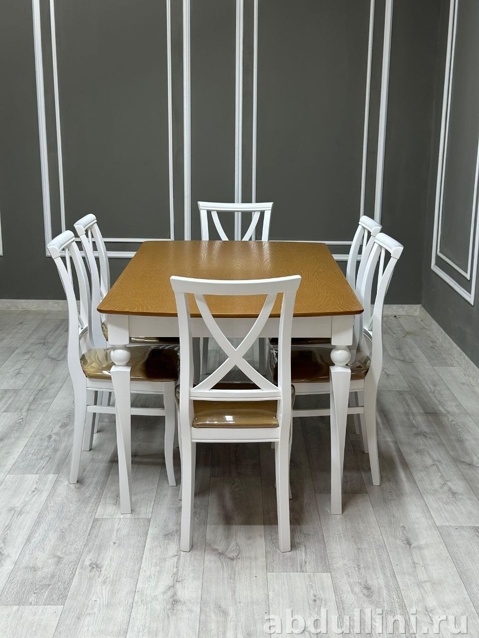 Столешница стола выполнена в теплом древесном оттенке, напоминающем дуб или сосну. Поверхность покрыта лаком, что придает ей легкий блеск и защищает от повреждений. Основание стола и каркасы стульев окрашены в матовый белый цвет, что делает комплект универсальным для различных интерьеров.