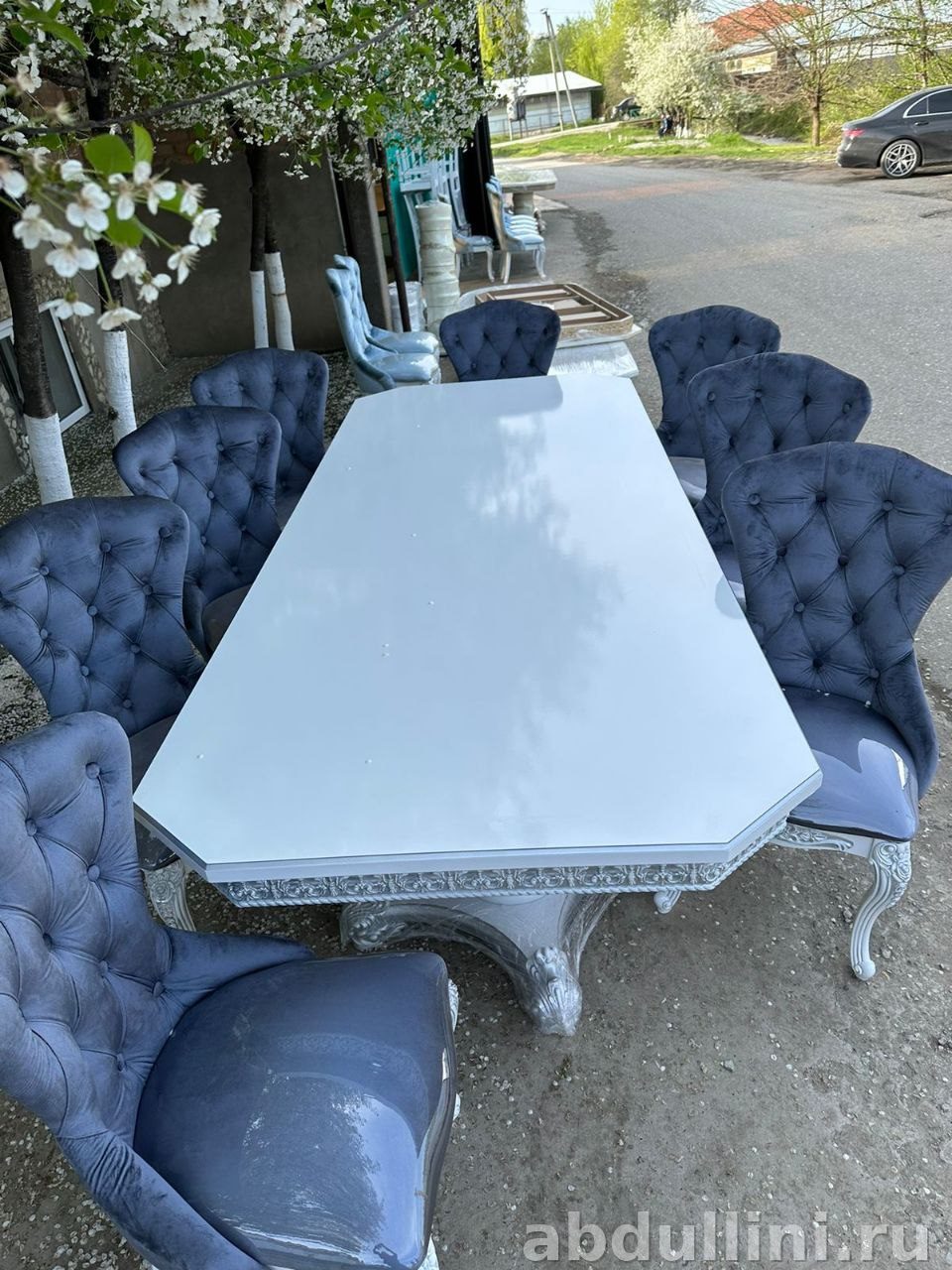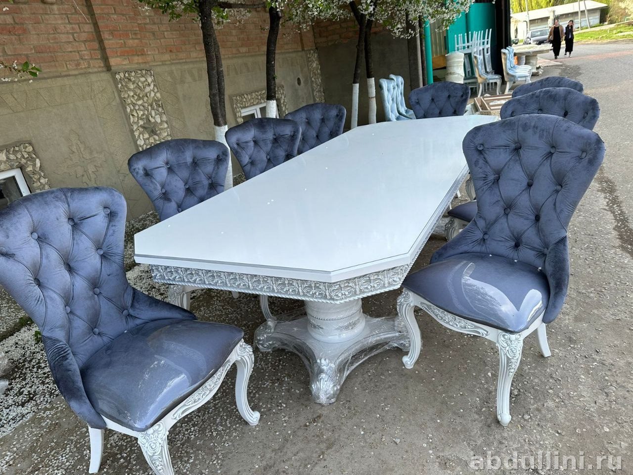 Комплект мебели включает обеденный стол и десять стульев, выполненных в стиле неоклассика с элементами барокко. Столешница стола – белая глянцевая, восьмиугольной формы со скошенными углами. Основание стола и декоративные элементы имеют серебристый оттенок с эффектом патинирования, что придает им винтажный вид.