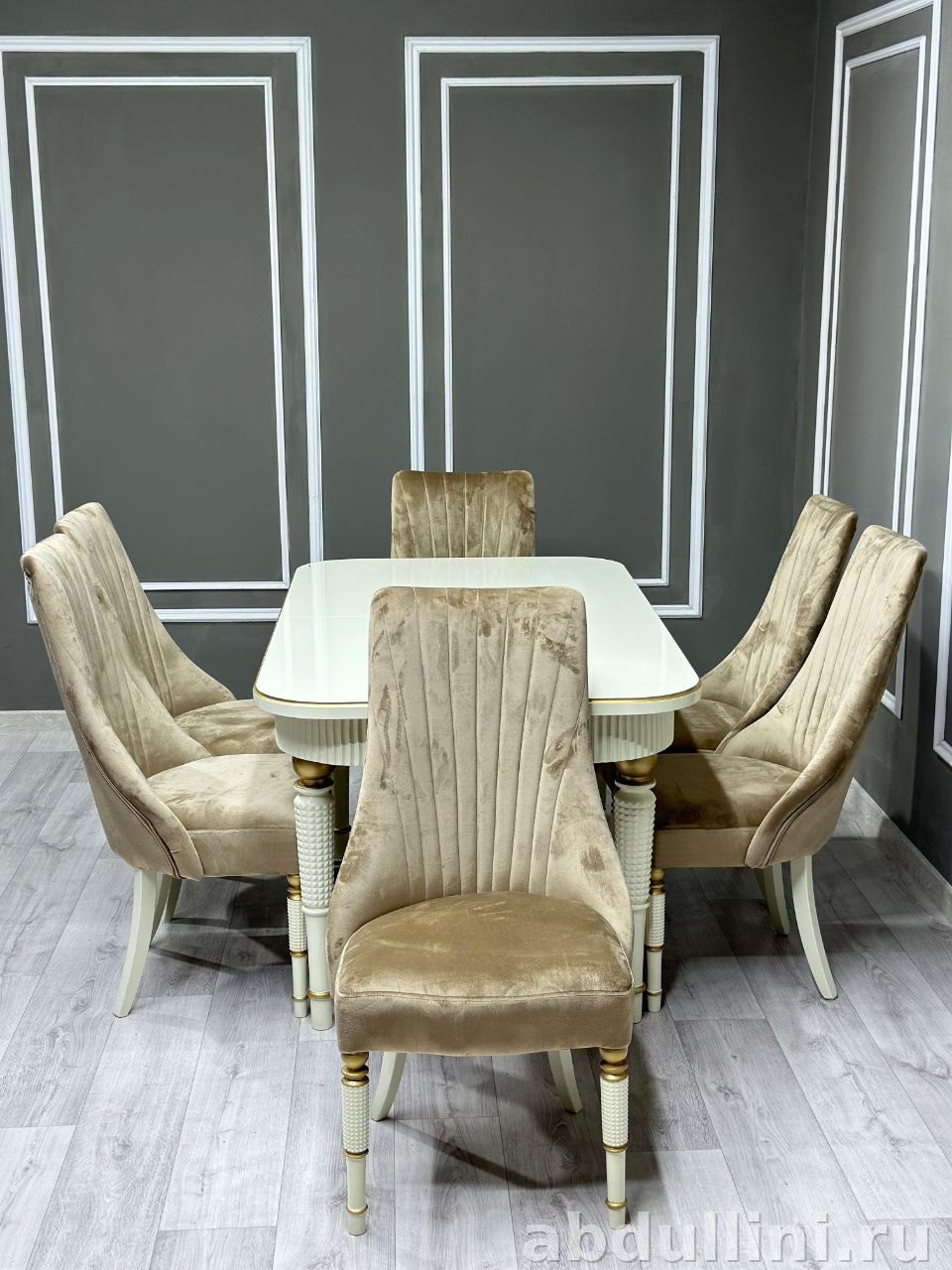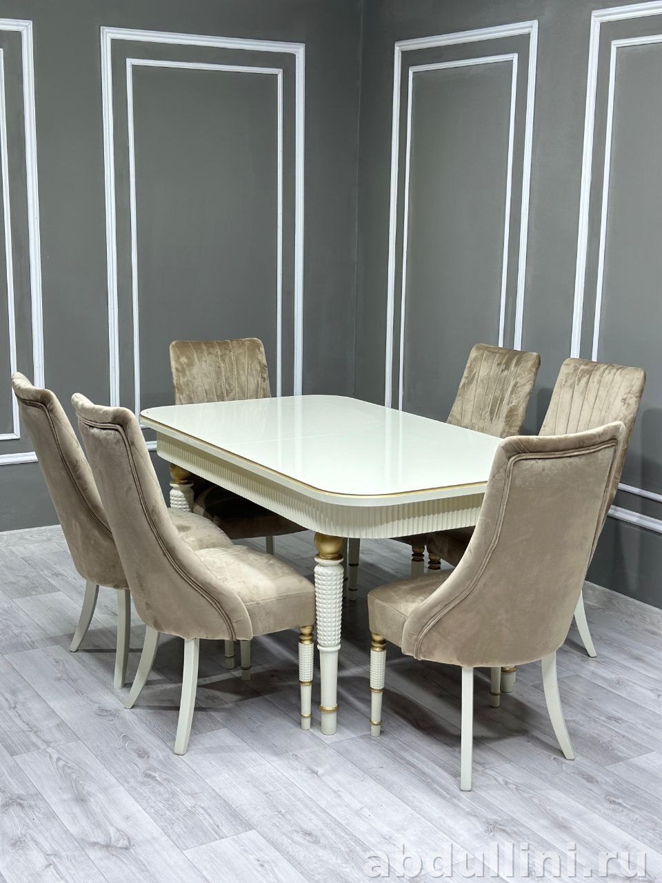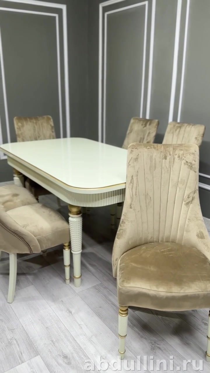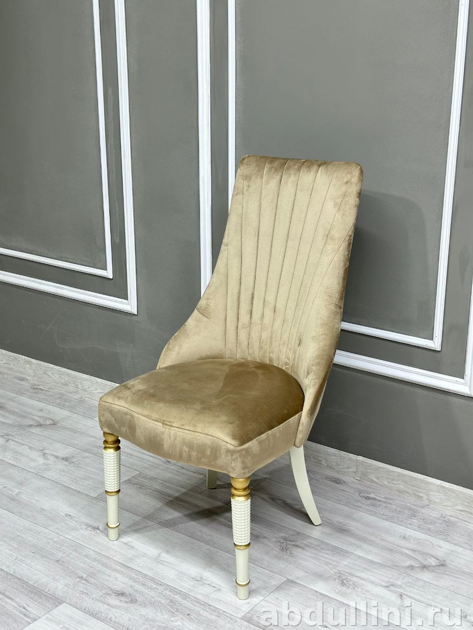 - Стулья: обивка бежевая с золотистыми акцентами, ткань мягкая, бархатистая. Ножки белые с золотистыми деталями.