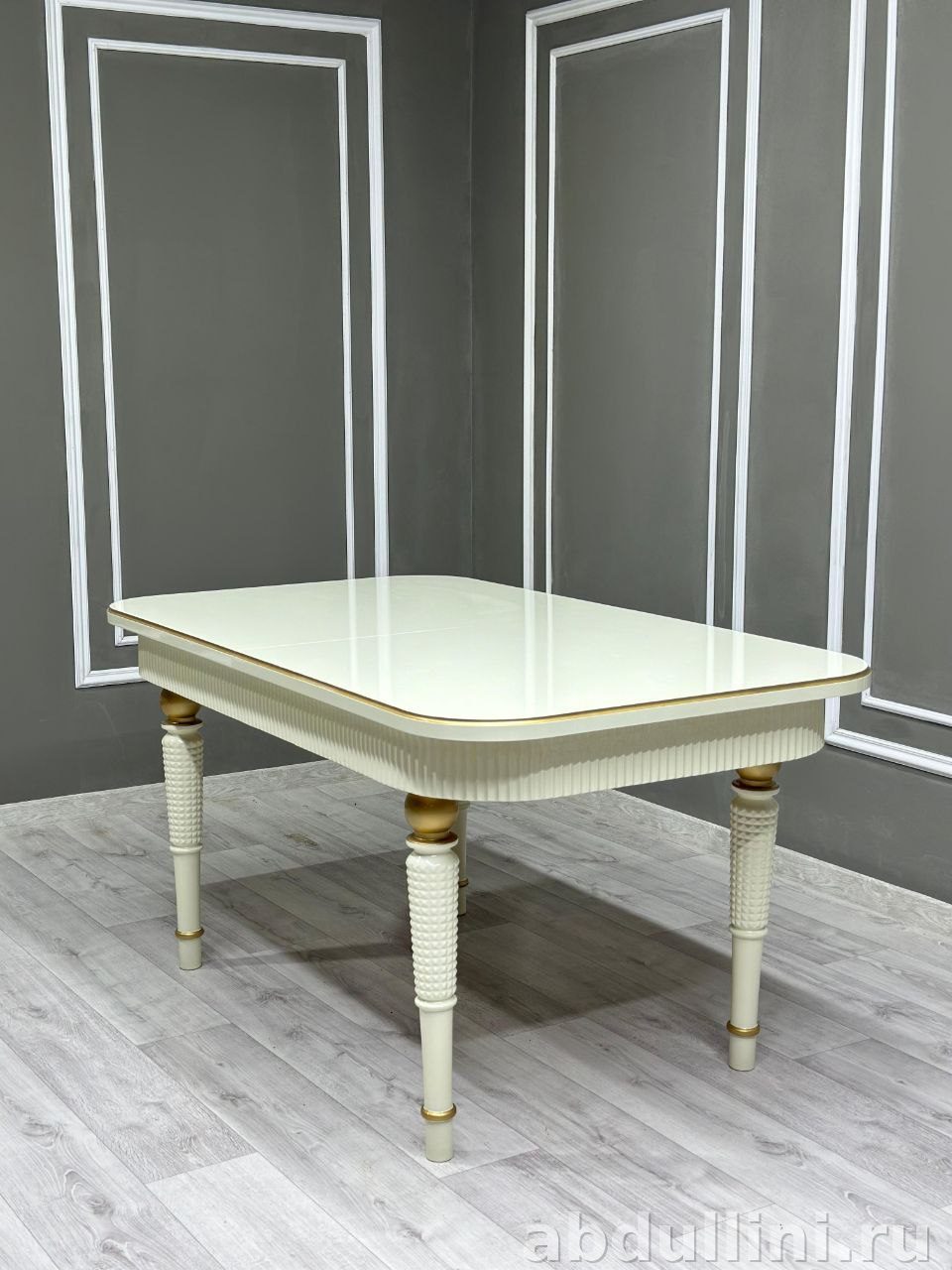 - Стол: столешница белая с глянцевым покрытием, основание белое с золотистыми элементами.