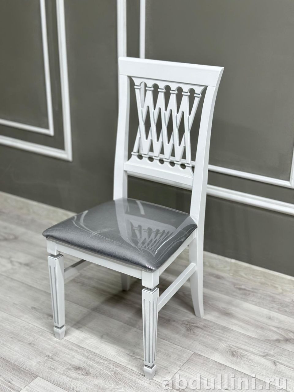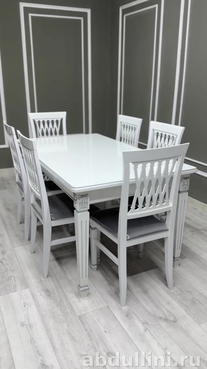 Стильный комплект мебели для обеденной зоны, выполненный в неоклассическом дизайне. Включает раздвижной стол и шесть стульев. Белый глянцевый цвет с серебристыми акцентами добавляет современности, а резные элементы придают красивый вид.