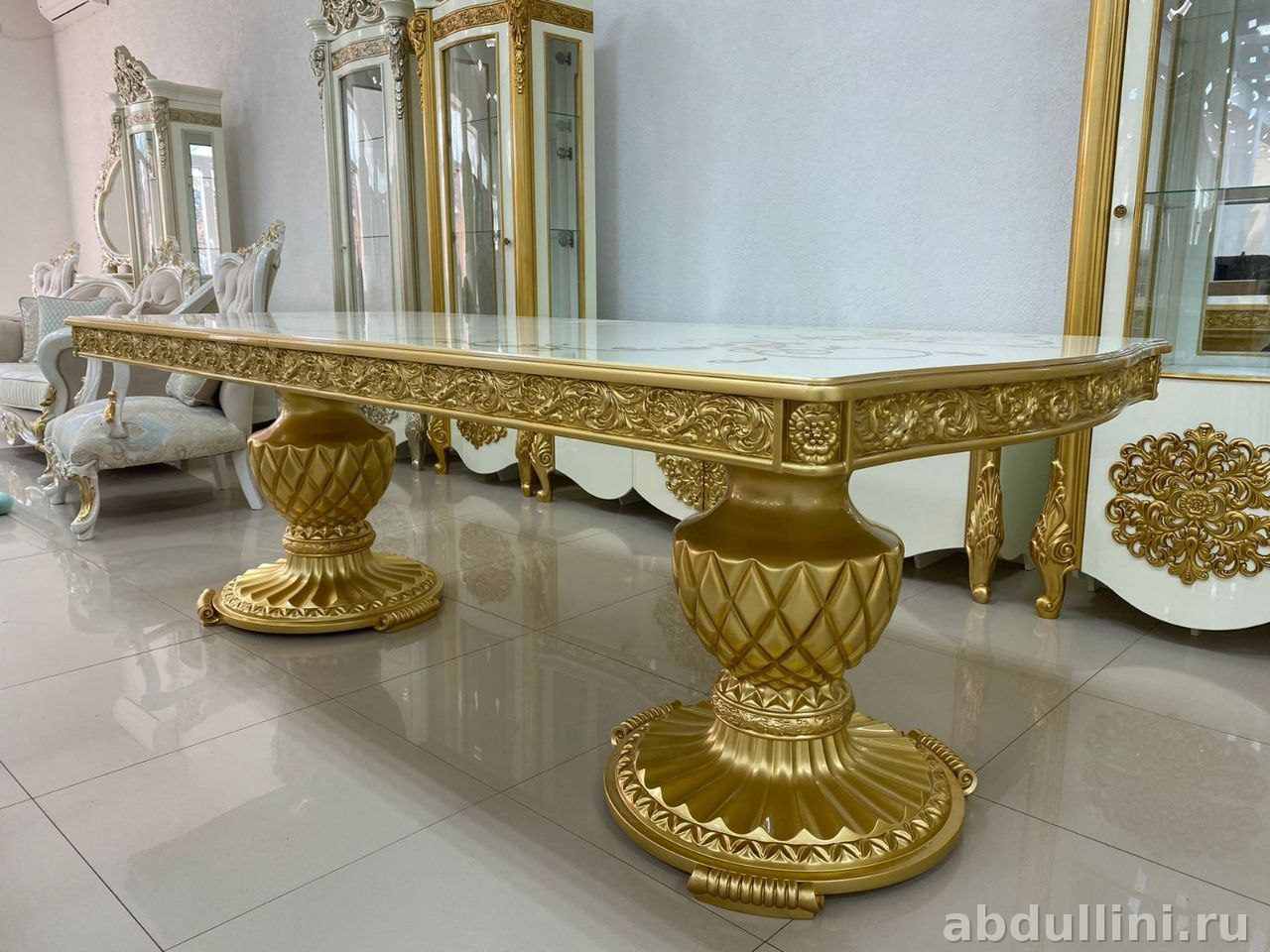 - Конструкция: стол прямоугольной формы, раздвижной механизм даёт увеличить длину с 250 см до 310 см. Ножки и края стола украшены рельефным золотым орнаментом.