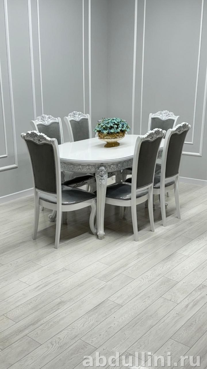 Комплект мебели Роза 3326 — это стильное и удобное решение для обеденной зоны. В комплект входит раздвижной овальный стол и шесть стульев с высокой спинкой. Мебель выполнена в неоклассическом стиле с элементами резного декора, что придает ей красивый вид.