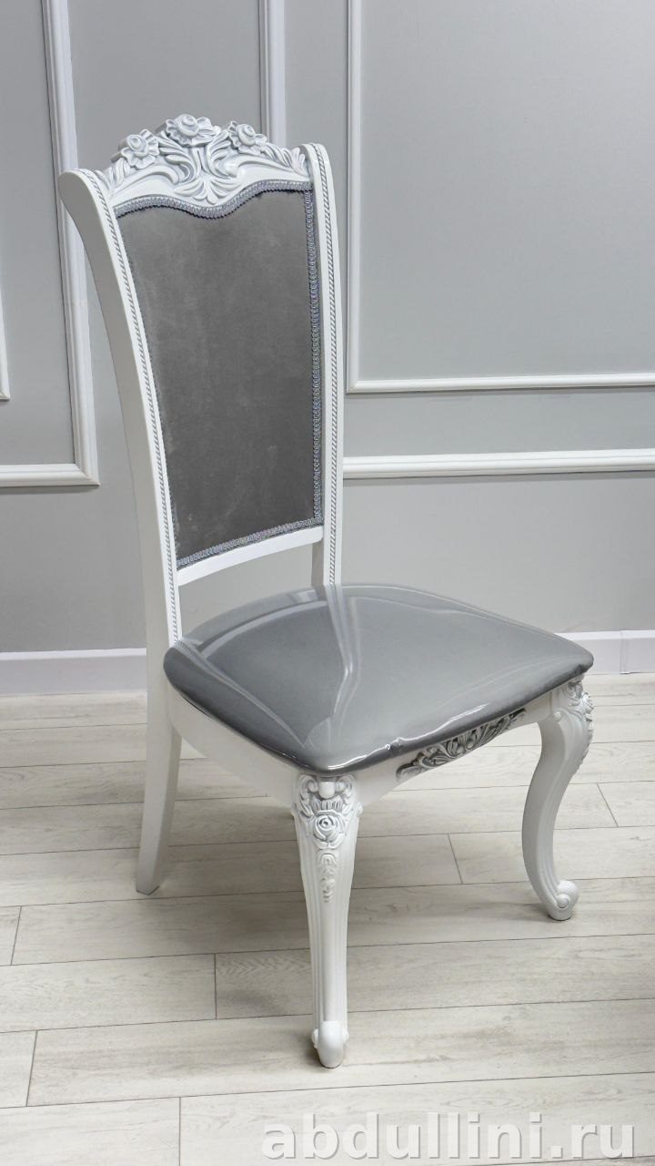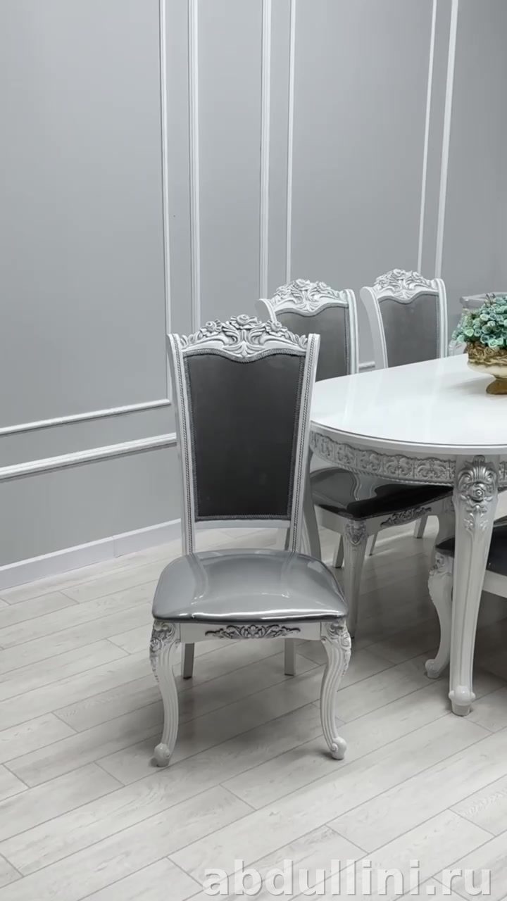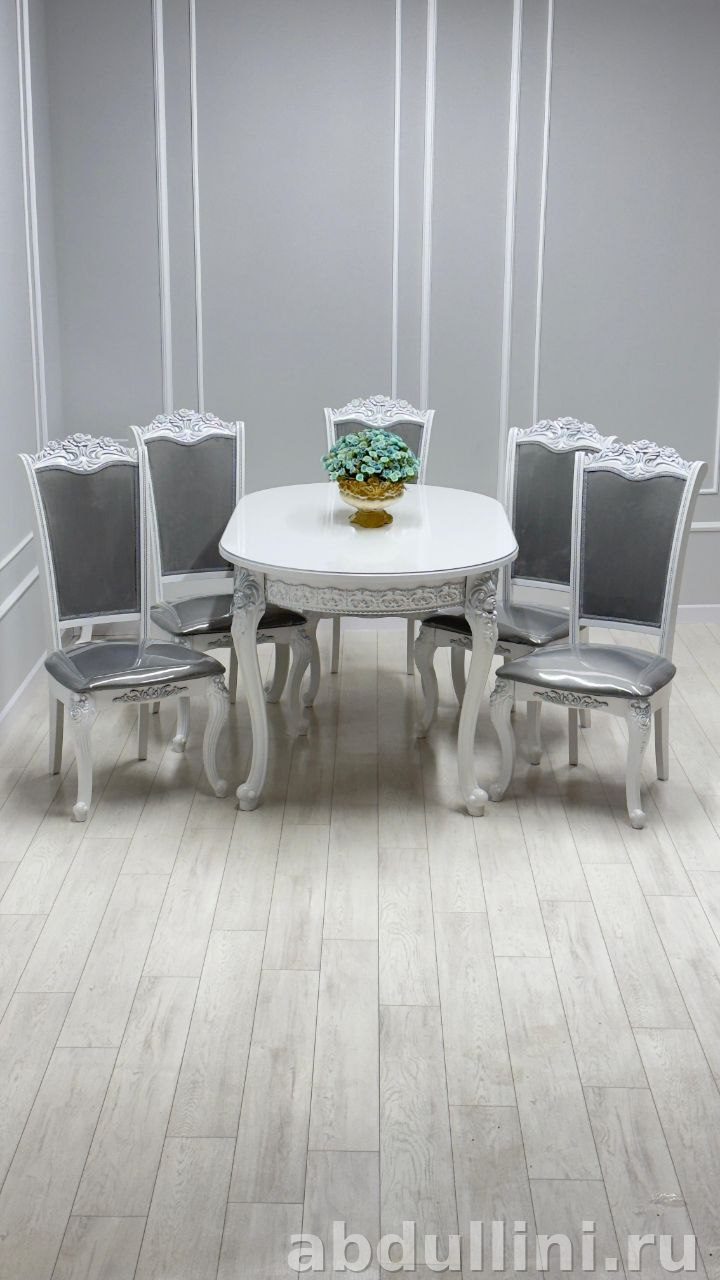 Цветовая гамма: белый с серебристыми акцентами. Стол и стулья имеют глянцевое покрытие, которое подчеркивает их форму и выделяет декоративные детали. Обивка стульев выполнена в сером цвете, что добавляет комплекту сдержанности и универсальности.