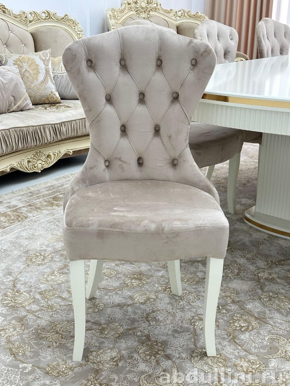 - Стулья «Сурен»: каркас из массива дерева, тканевая обивка бежевого цвета, высокая спинка, белые ножки.