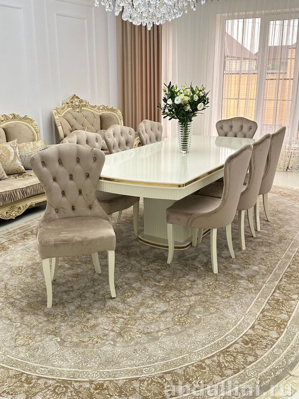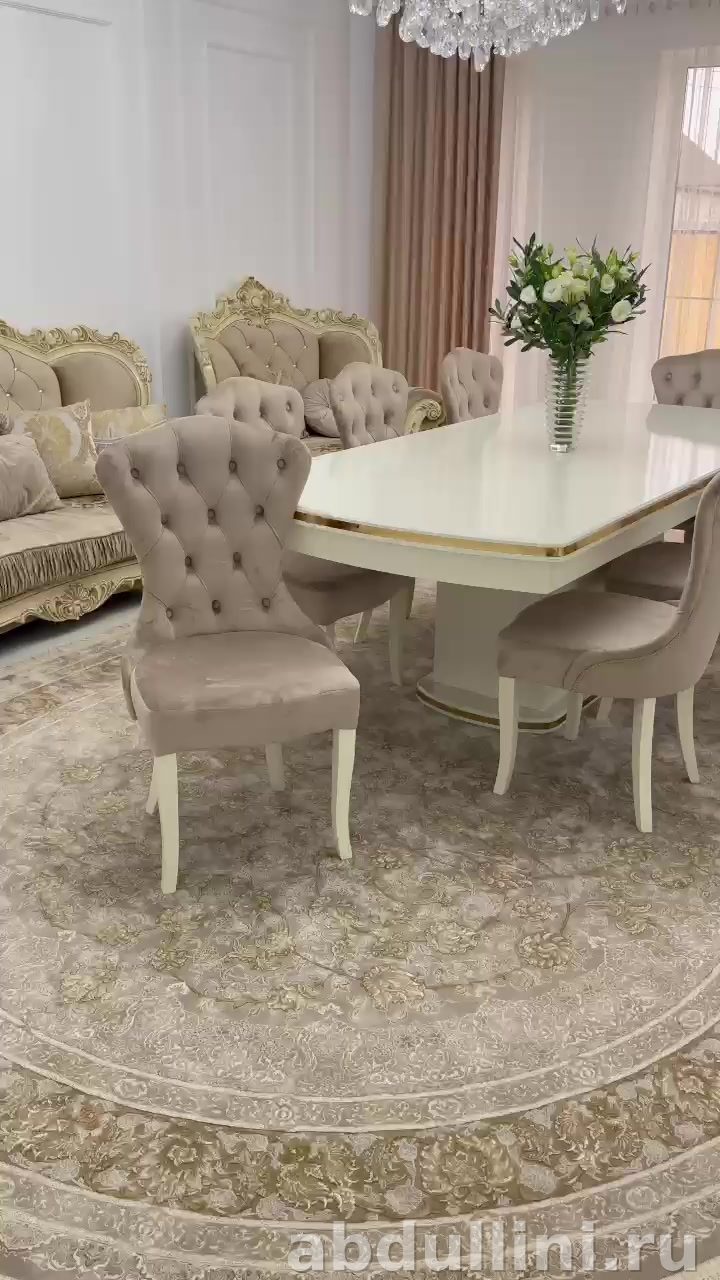 Стол выполнен из МДФ с глянцевой белой столешницей, украшенной золотистыми декоративными полосами по периметру. Основание стола — массивное, с вертикальными элементами, что обеспечивает устойчивость и долговечность. Стулья обтянуты мягкой тканью бежевого оттенка, ножки — белые, каркас из массива дерева. Обивка стульев — велюр или ткань с бархатистой текстурой.