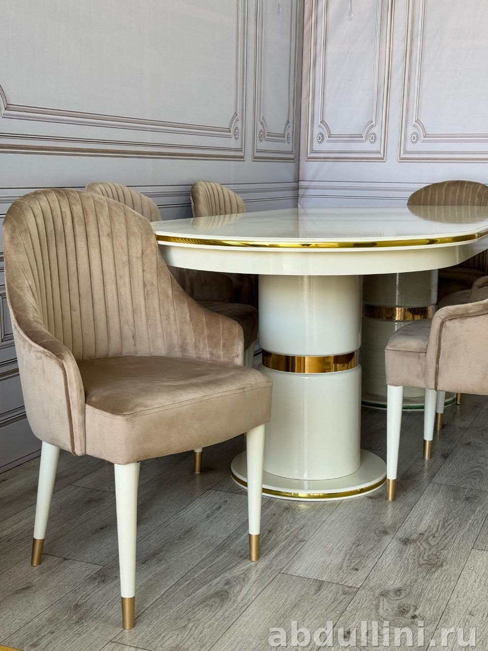 - Стол: столешница — глянцевый МДФ, основание — массивное цилиндрическое с золотистой полосой. Размеры: 200 см (36 500 ₽) или 240 см (37 500 ₽). Раздвижная версия (200/240 см) — 41 500 ₽.
