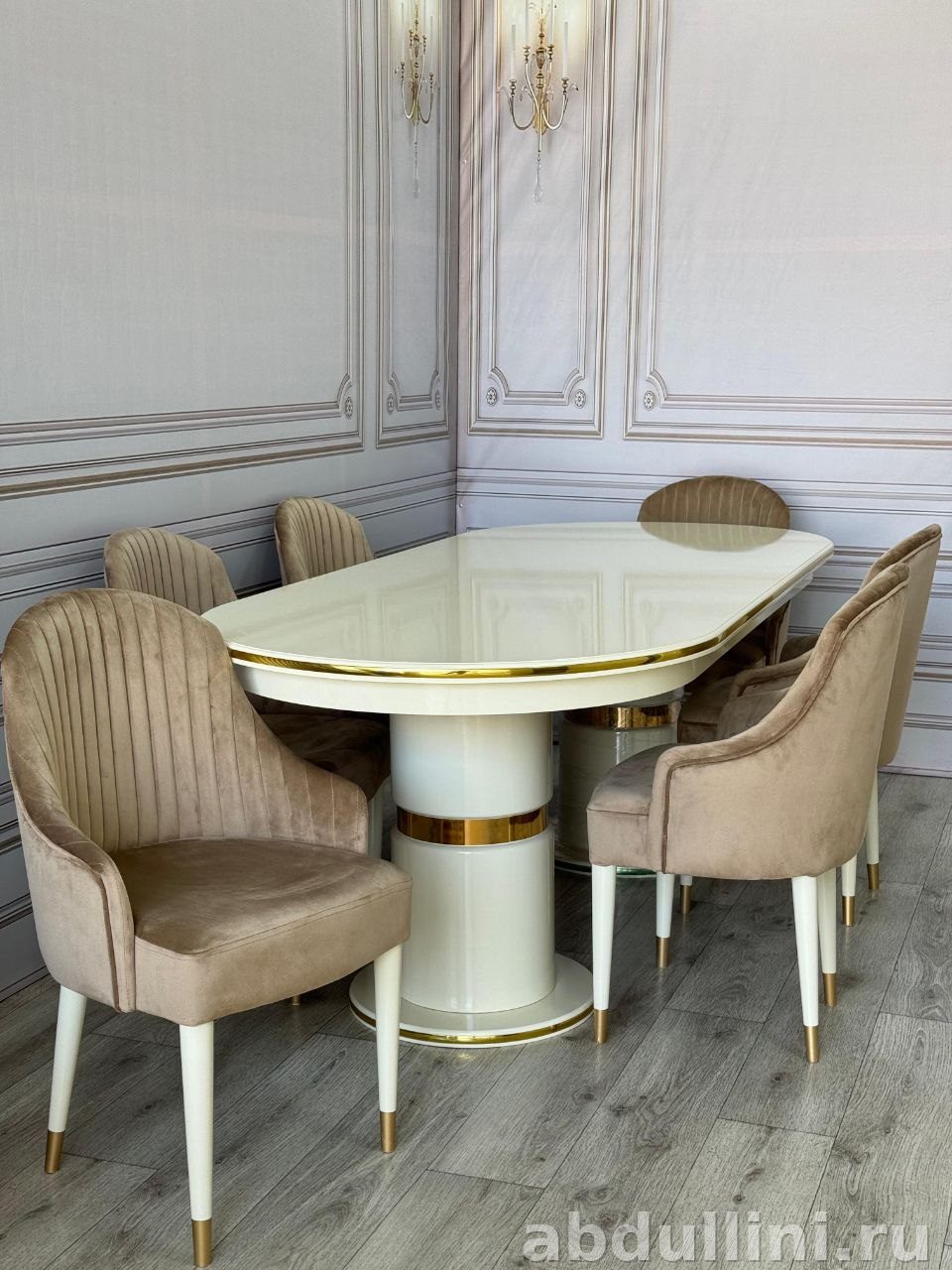 Комплект для столовой в стиле неоклассика: овальный стол с глянцевой столешницей цвета слоновой кости и золотистой окантовкой, 6 бархатных стульев с деревянными ножками.